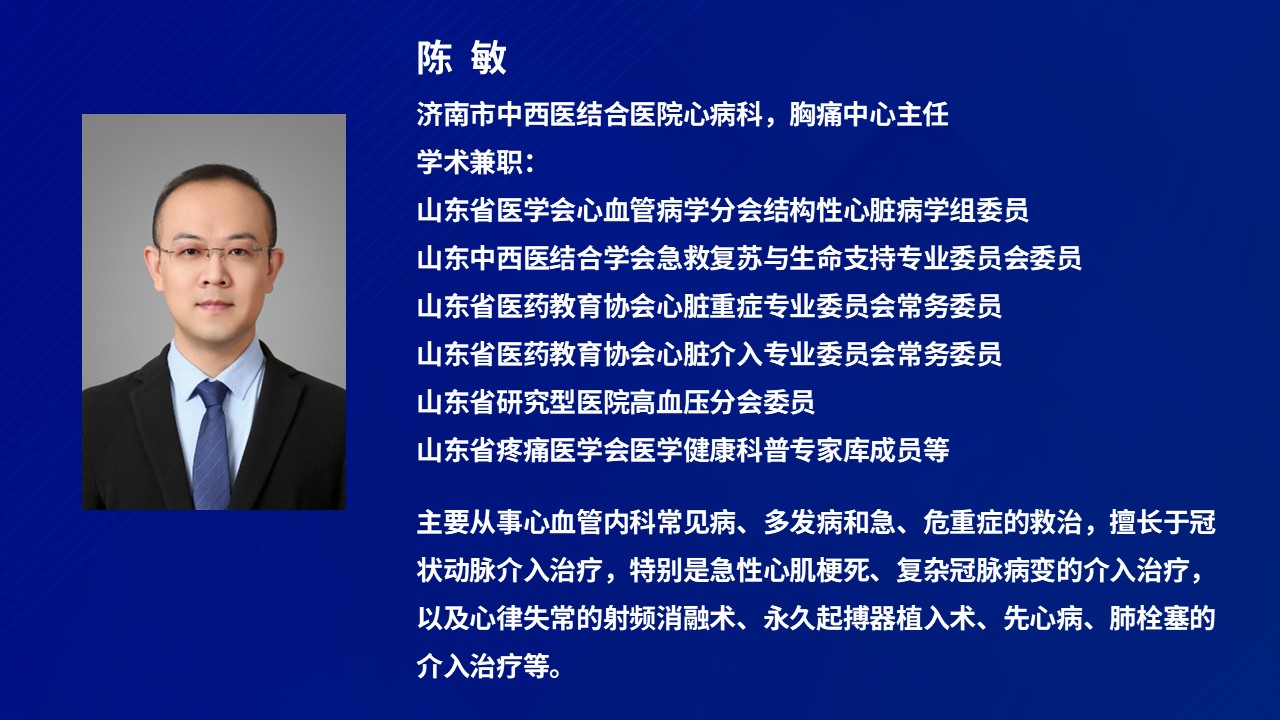 作为从事心病科临床、科研工作十余年的专家,陈敏擅长冠心病的介入诊疗,对高血压病、心力衰竭、心律失常等疾病的优化药物治疗有着丰富经验,同时作为医院胸痛中心负责人,他在急性心肌梗死等急危重症的救治上也积累了大量实战经验。