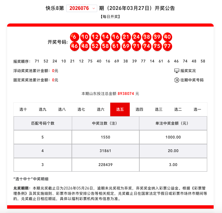 2026年3月27日,快乐8游戏第2026076期开奖,快乐8游戏1000万元促销活动的第五期。