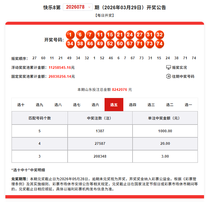 2026年3月29日,快乐8游戏第2026078期开奖,快乐8游戏1000万元促销活动的第七期。