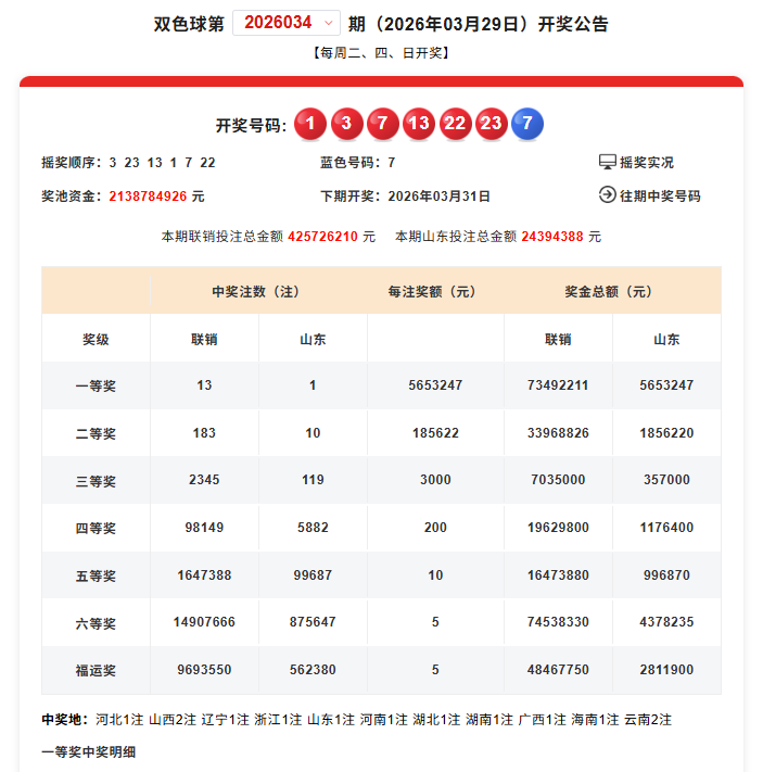 3月29日,福彩双色球第2026034期开奖,当期销售4.25亿元,筹集公益金1.53亿元;当期中出一等奖13注,单注奖金565.32万元,被河北、山西、辽宁、浙江、山东、河南、湖北等11地购彩者幸运获得;中出二等奖183注,单注奖金18.56万元;中出“福运奖”969.35万注,“福运奖”奖金合计超过4846万元,其中,山东中得“福运奖”56.23万注。