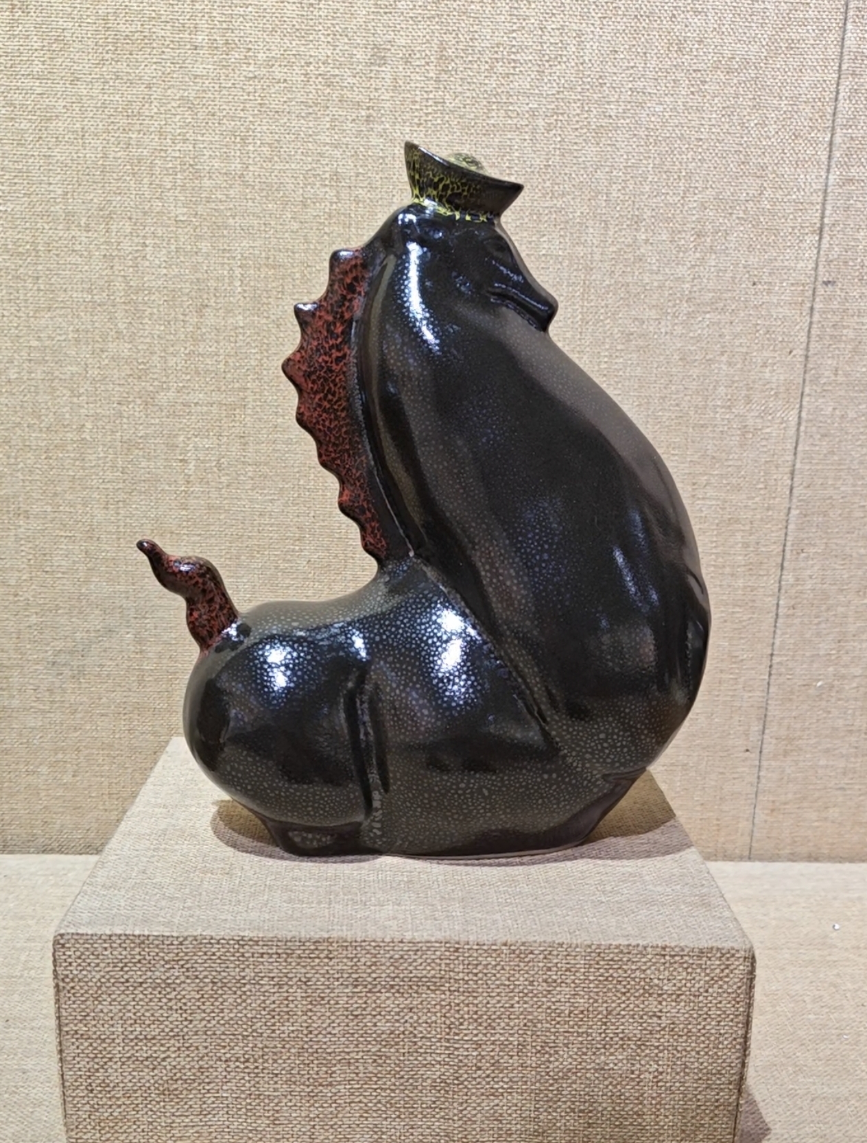 在周冠丞的手中,雨点釉的灵魂在窑火与釉料的精妙配合中呼之欲出。马身星点细密如秋夜繁星,元宝与红釉点缀处星点稍疏,虚实对比之间作品造型更加灵动。