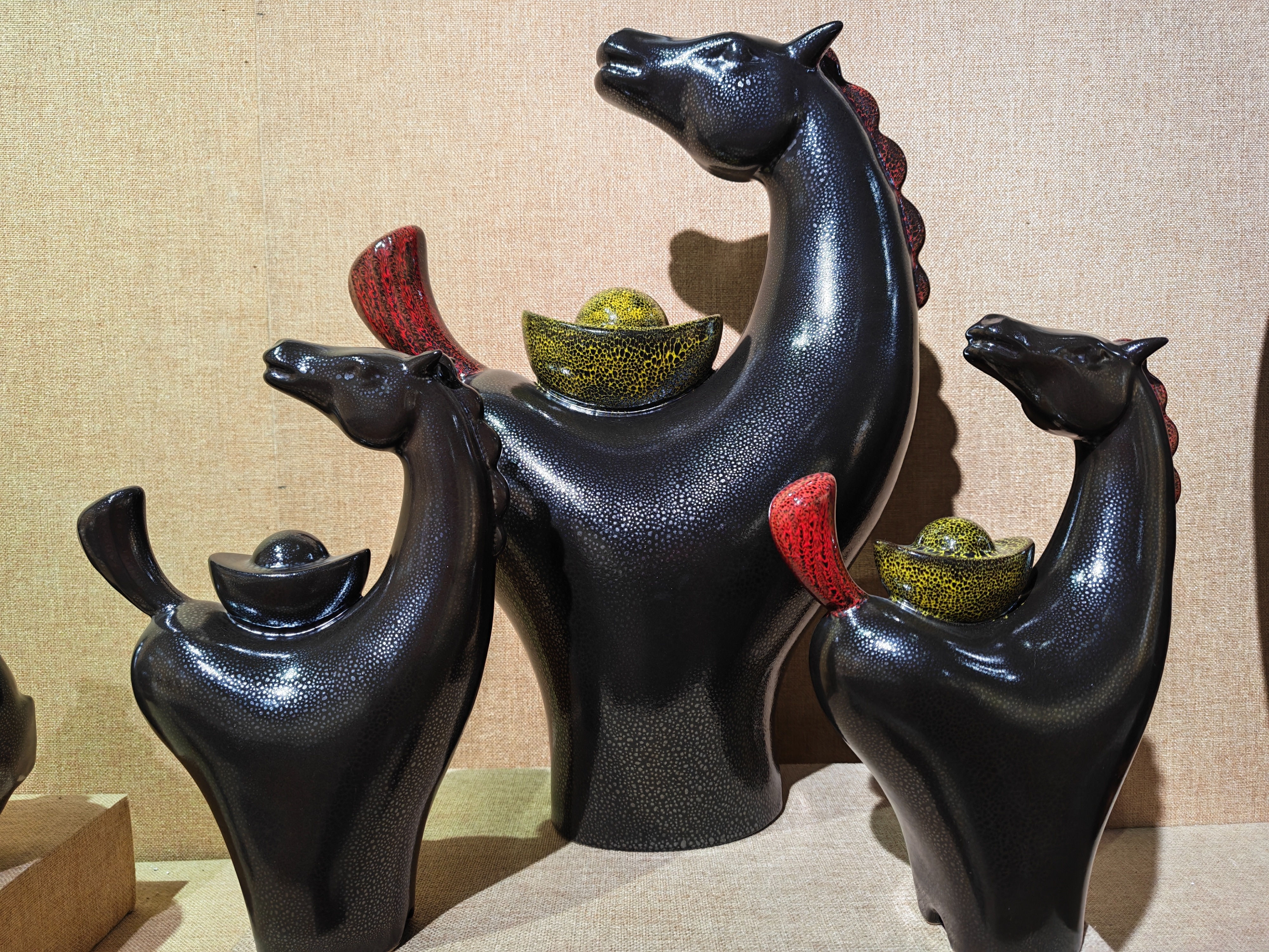 “拿另一件作品‘马上发财’来说,它以传统回头马为原型,线条经过轻量化改造,褪去古器的厚重,更贴合当代审美。马首微扬,圆润线条勾勒出灵动姿态,背上船形元宝顶部的金球与釉面银星呼应,暗藏‘元宝藏星’的设计。”