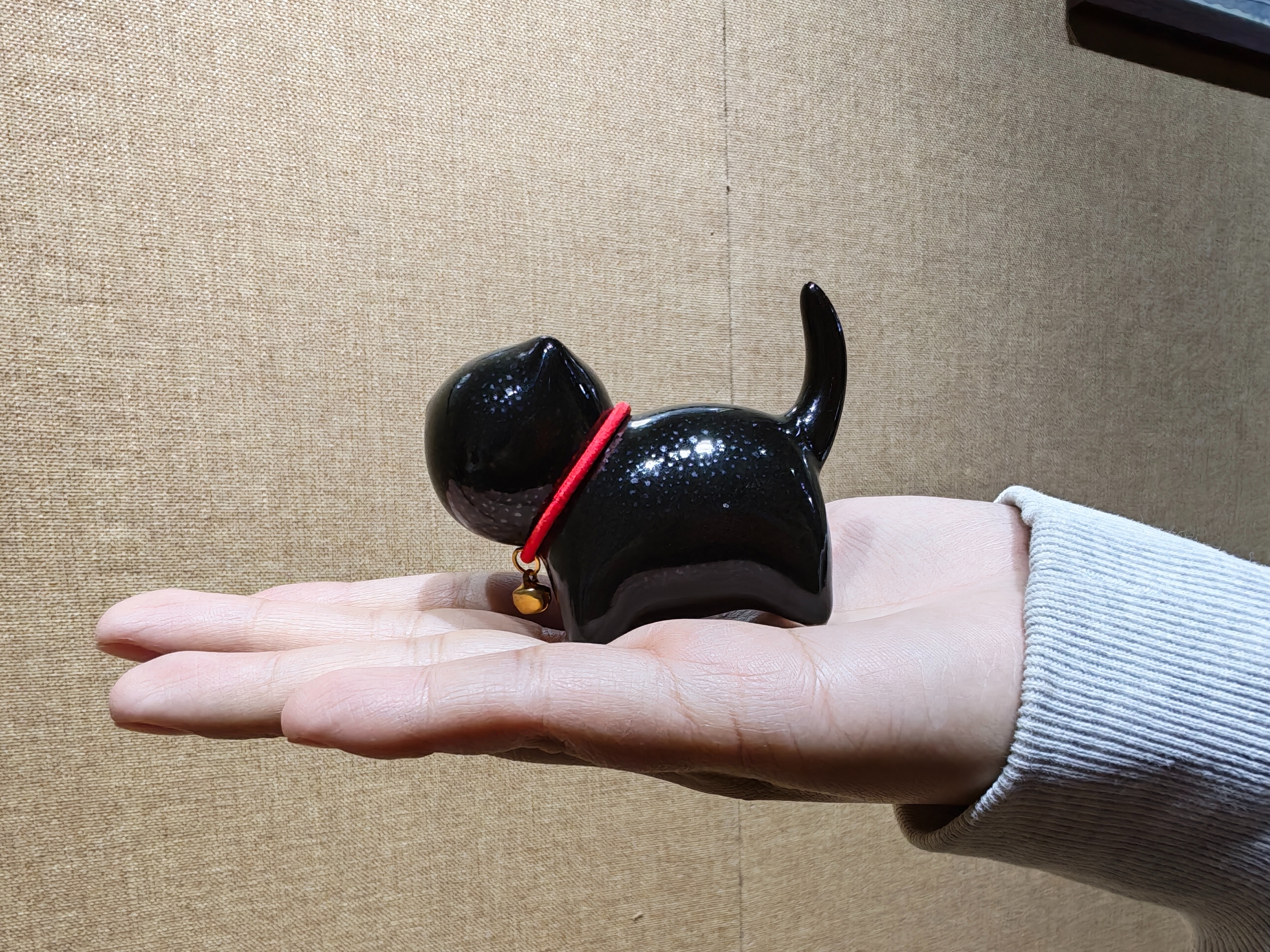 “这是我们今年新推出的生肖作品‘马上有钱’,它的造型为一匹雄壮挺立的唐马,以传统陶瓷工艺结合吉祥寓意设计而成,烧制时釉面自然形成细密斑点,犹如夜空繁星,每件作品的星点纹理皆为自然窑变而成。” 第四代博山雨点釉制作技艺市级代表性传承人周冠丞向记者介绍。