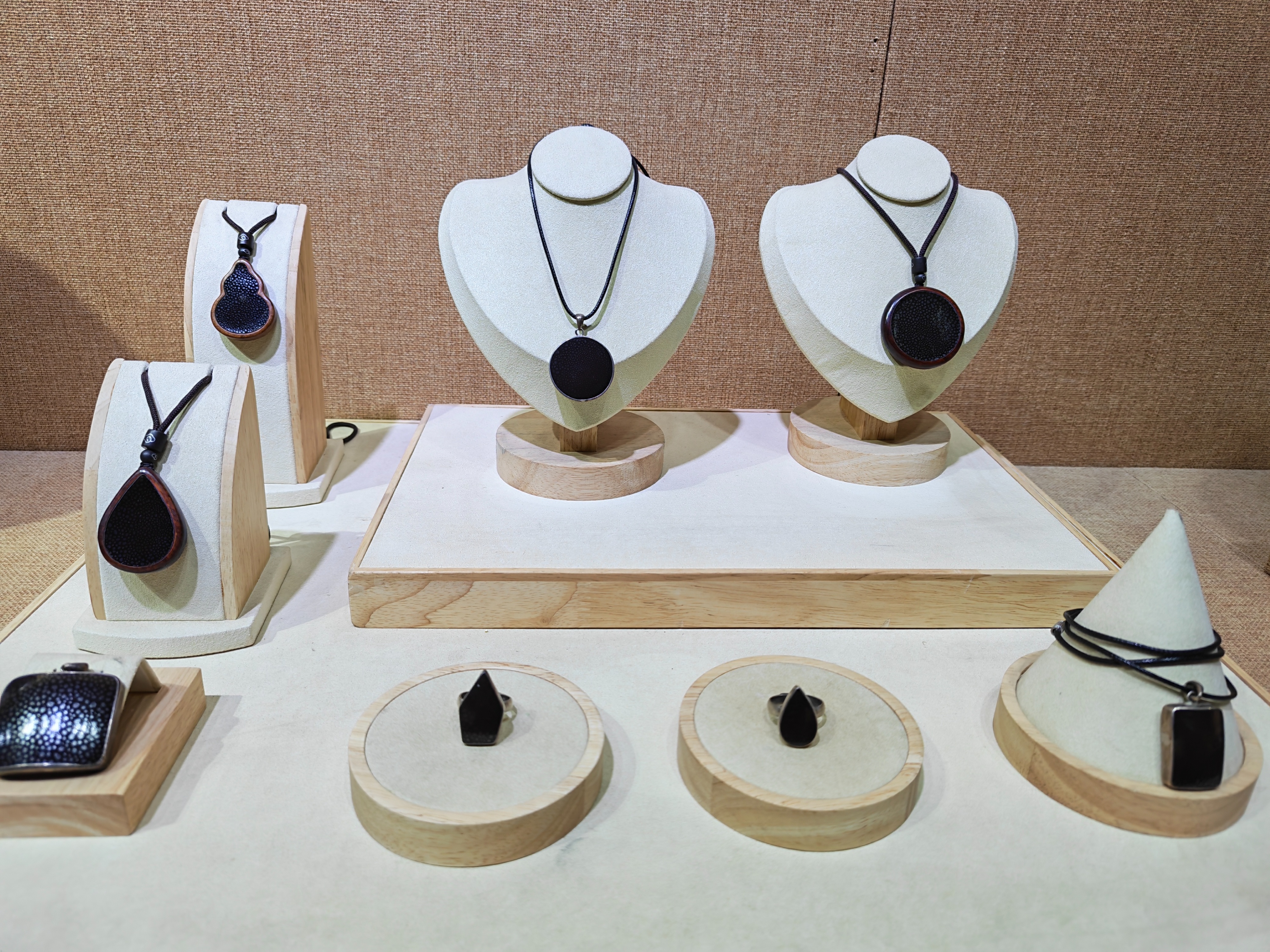 “这些首饰,包括项链、戒指,都是用雨点釉制作而成,造型古朴大气,配以浅色新中式或者旗袍,特别能够衬托和提升人的气质。”周冠丞说。