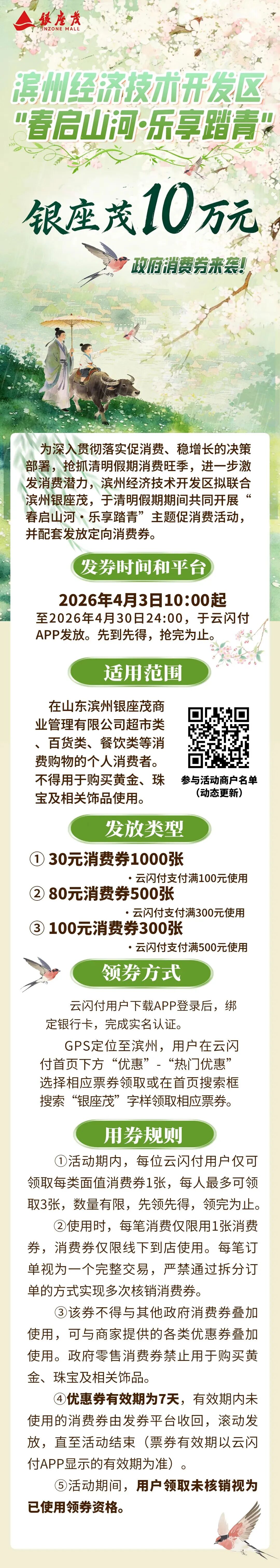 滨州经济技术开发区“春启山河·乐享踏青”银座茂政府消费券4月3日开抢