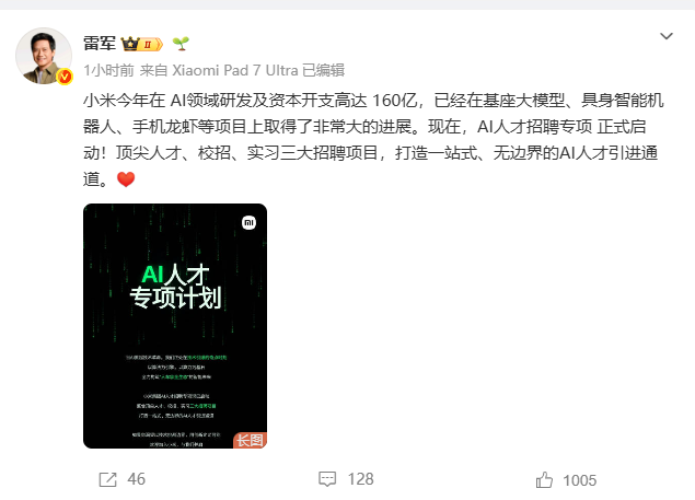 3月30日,小米创办人、董事长兼CEO雷军发文表示,小米今年在AI领域研发及资本开支高达160亿,已经在基座大模型、具身智能机器人、手机龙虾等项目上取得了非常大的进展。现在,AI人才招聘专项正式启动。(雷军新浪微博)
