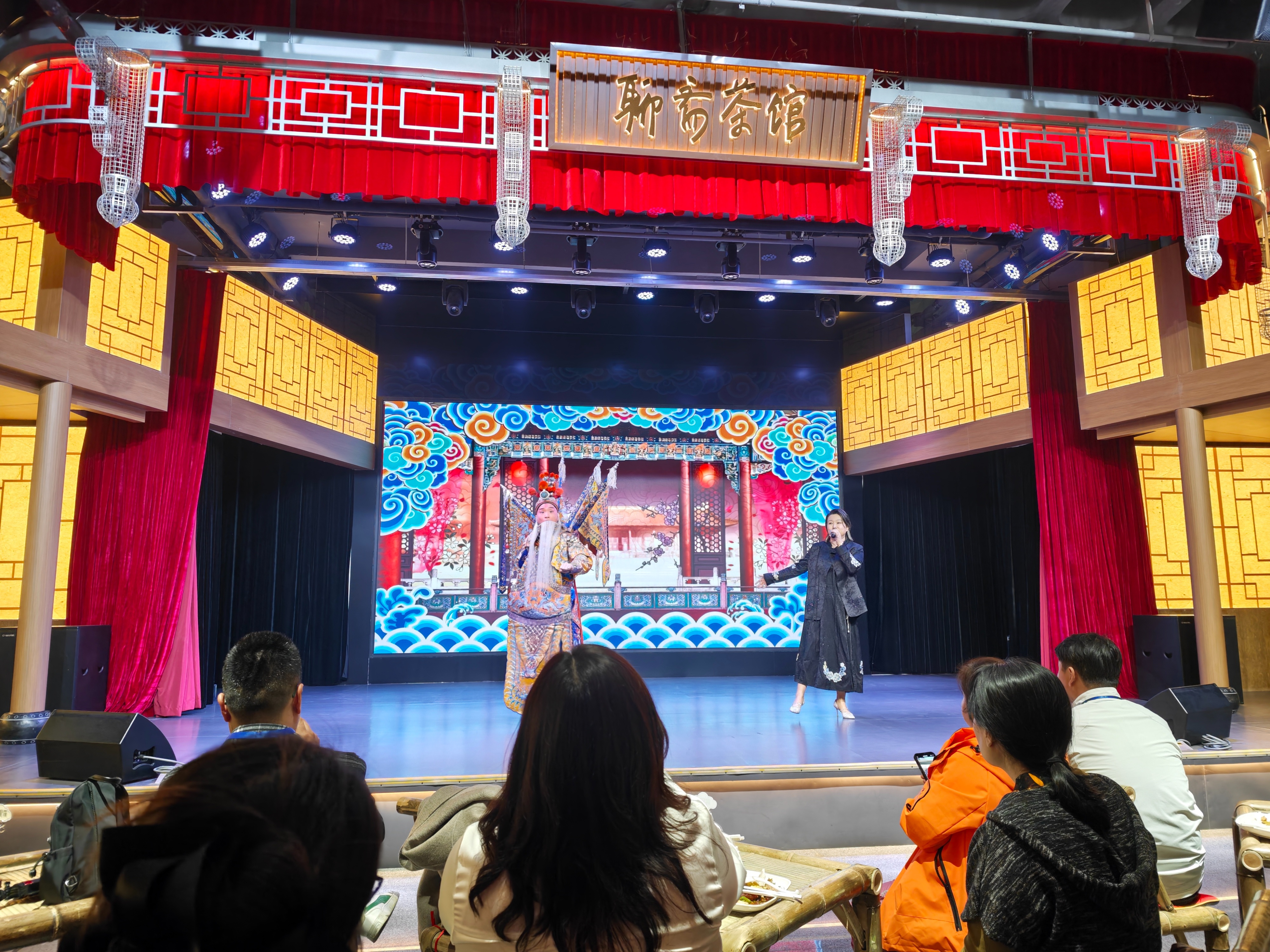 会议结束后,一行人首先走进拥有浓厚文化气息与市井气息的聊斋茶馆。茶馆创始人耿嘉鹏介绍道,茶馆缘起于蒲公龄先生300年前设茶摊收集民间故事的佳话,他分享了建设这个茶馆的初心,希望给大家提供一个可以听故事、讲故事的场所,将自古以来“围坐品茗、闲谈叙趣”的闲适和美好延续下去。午间时分,舞台上相声、聊斋俚曲等特色节目轮番上演,店内提供茶水饮料、零食、餐饮等服务,消费不贵,却可以在这里享受一份惬意的时光。