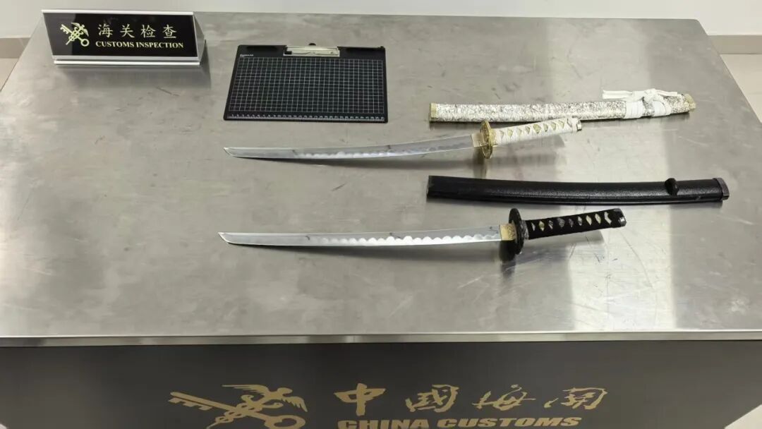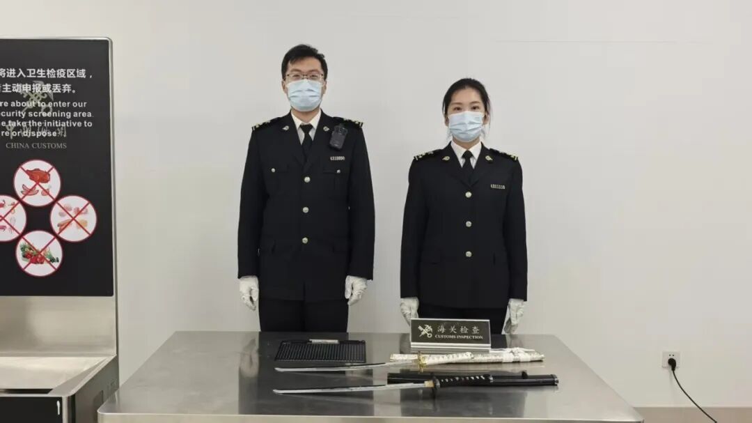 近日,济南机场海关对入境旅客行李进行监管时,发现旅客行李物品机检图像异常。经开箱查验,从两名旅客随身行李中发现武士刀两把,刀身长度455毫米。经相关部门鉴定,2把武士刀均属于管制刀具。根据规定,管制刀具属于限制进出境物品,未经许可不得随意邮寄、携带进出境。目前海关已依法对该刀具予以暂扣。
