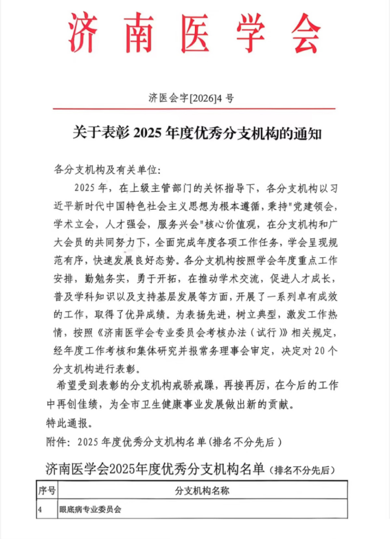济南医学会眼底病专业委员会获评2025年度优秀分支机构