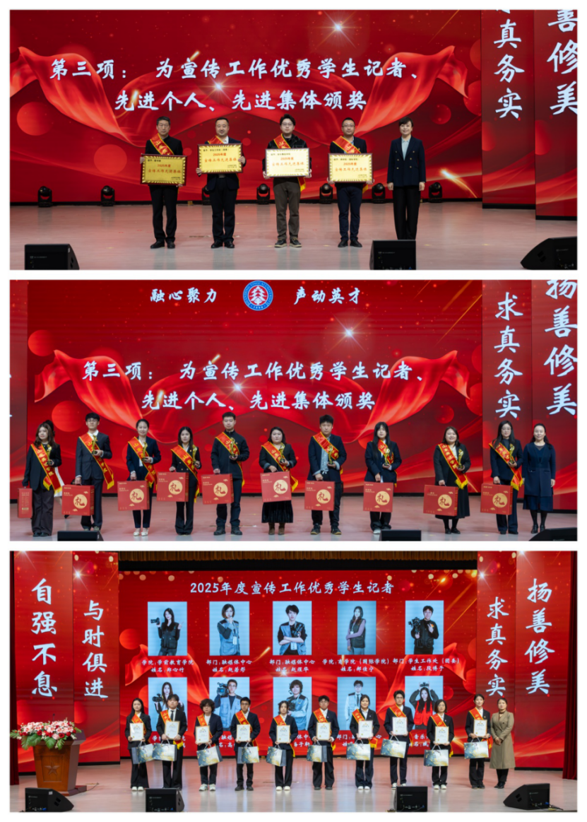 会上,张瑞君宣读了《山东英才学院关于表彰2025年度宣传工作先进集体及个人的决定》。王晓娜、李晓玲、张瑞君分别为“先进集体”“先进个人”“优秀学生记者”颁奖。每一个获奖集体与个人都有专属颁奖词,榜样的力量激励着在场的每一位师生。