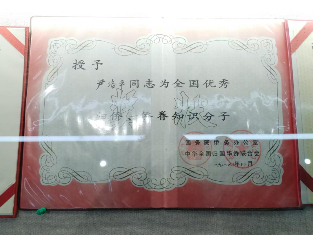 1989年尹洛平被授予全国优秀归侨、侨眷知识分子证书