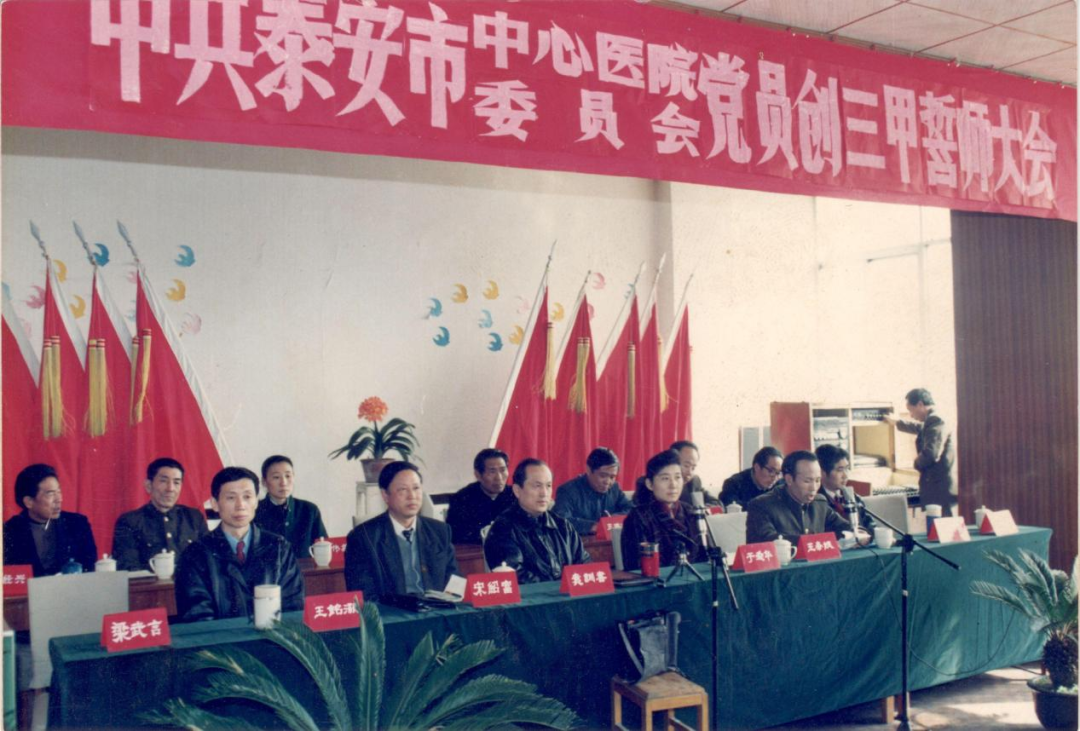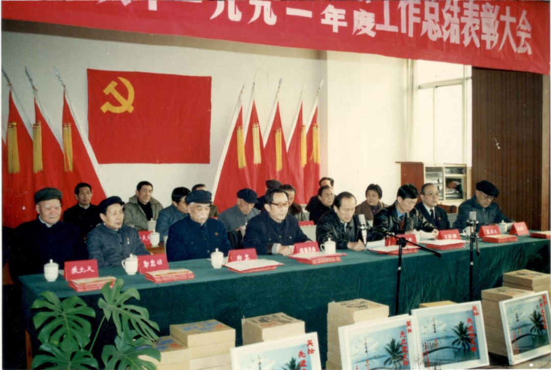 1993年2月13日,院党委在七楼会议室召开党员创三甲誓师大会。图为大会主席台