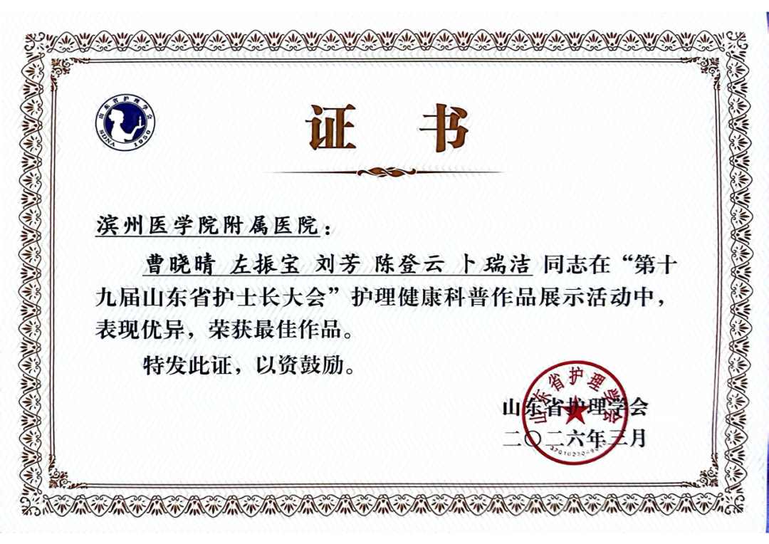 在“科普惠健康”护理健康科普作品展示大赛中,全省共有250项作品参评,设有最佳作品、特色作品、优秀作品三个评选等次。滨医附院产科LDR病区曹晓晴团队的科普作品《乳润新生,点亮生命第一缕光》,以通俗易懂的语言和直观清晰的演示,系统讲解母乳喂养核心知识与实用技巧,荣获“最佳作品”奖。