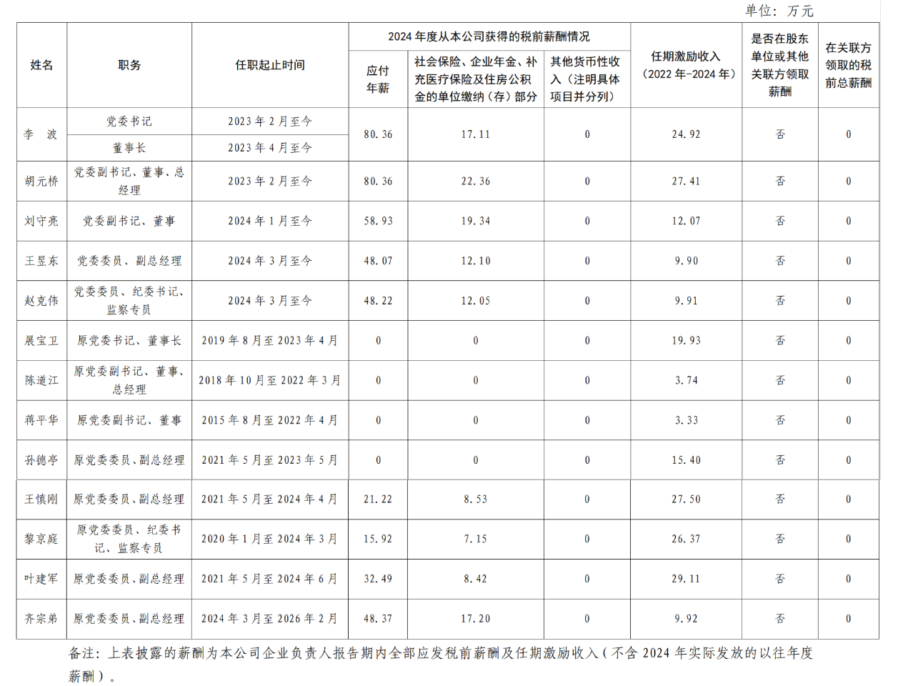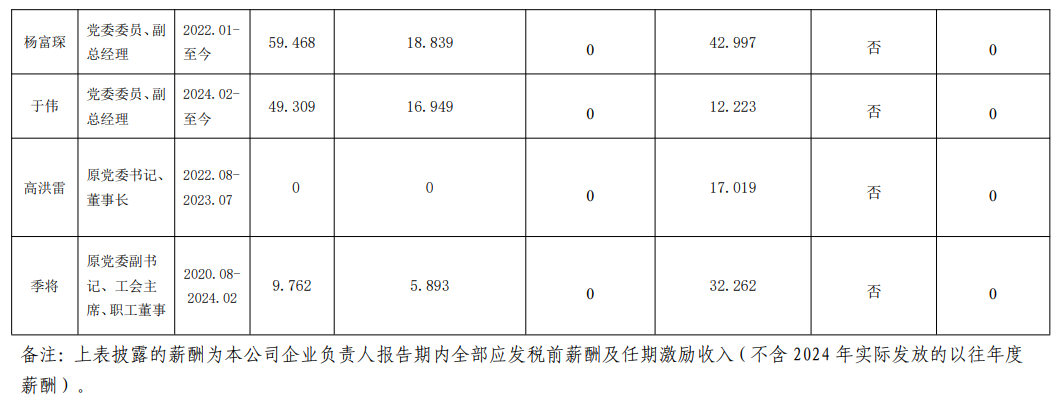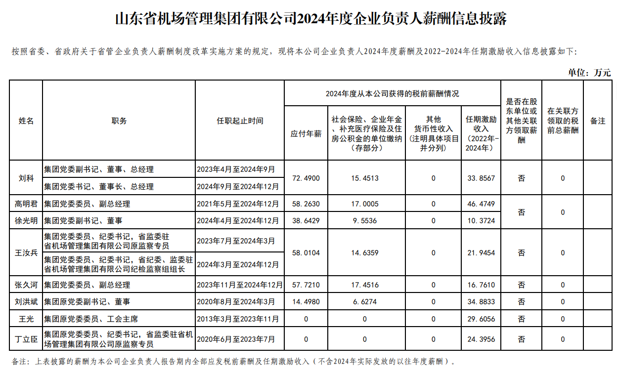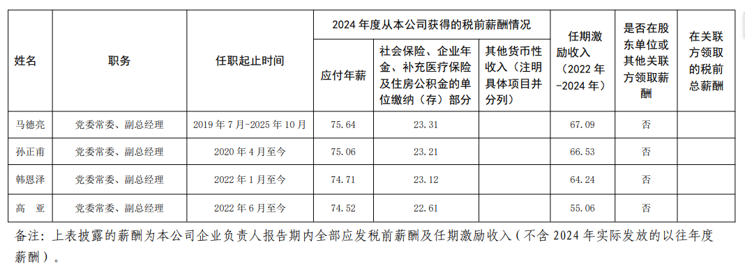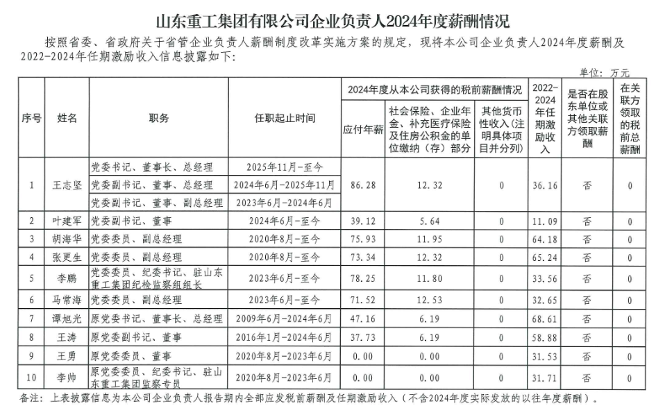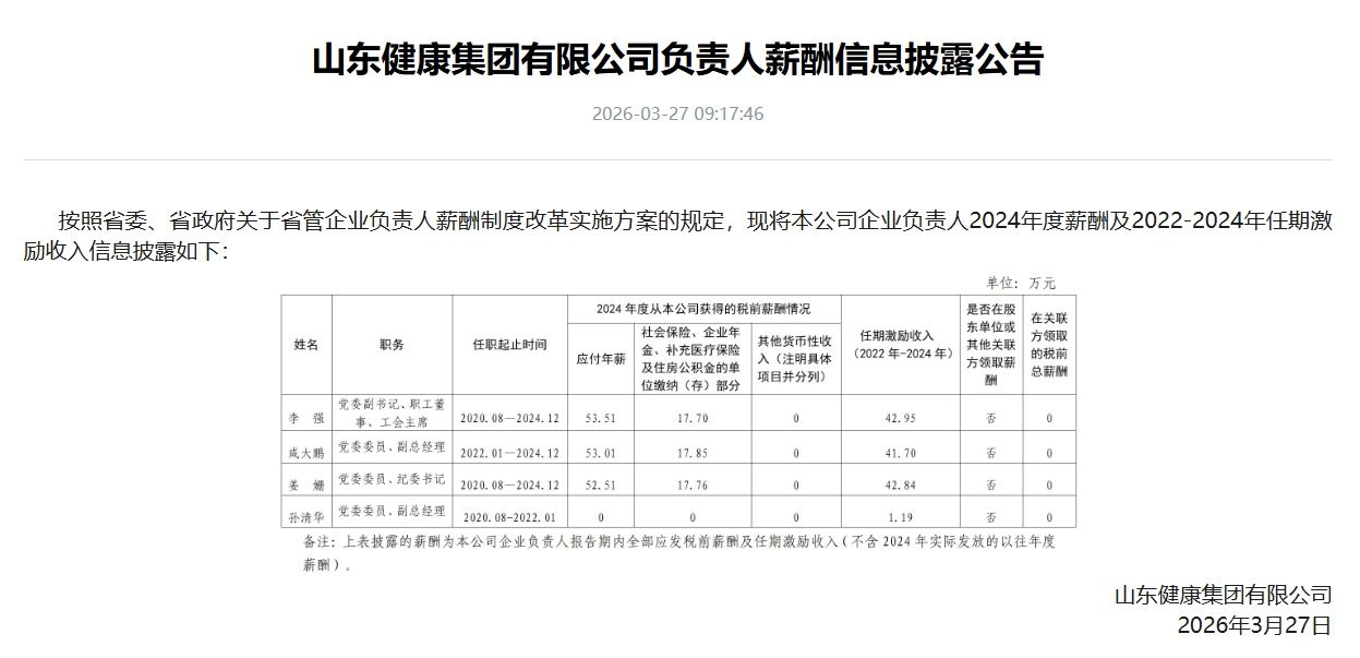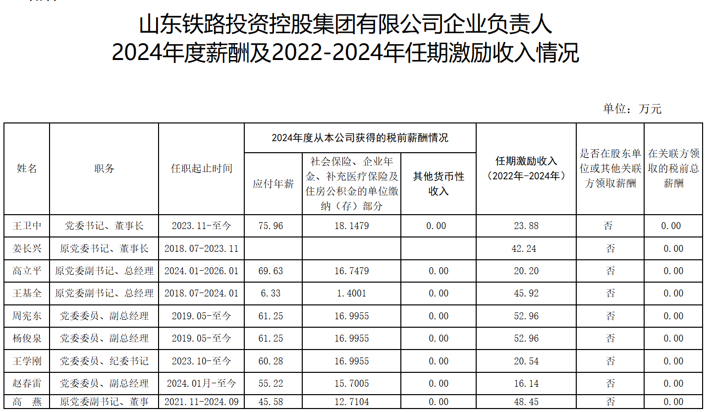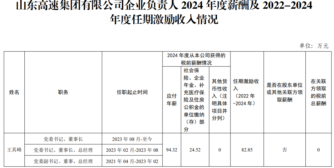 信息显示,4家省属企业负责人2024年薪酬超过90万元。其中,山东高速集团有限公司党委书记、董事长王其峰应付年薪94.32万元;山东省港口集团党委书记、董事长霍高原,党委副书记、董事、总经理李奉利应付年薪94.02万元;山东黄金集团有限公司原党委书记、董事长李航应付年薪92.05万元,2024年6月—2025年3月任山东黄金集团有限公司党委书记、董事长,2023年10月—2024年6月任党委书记、董事长、 总经理。