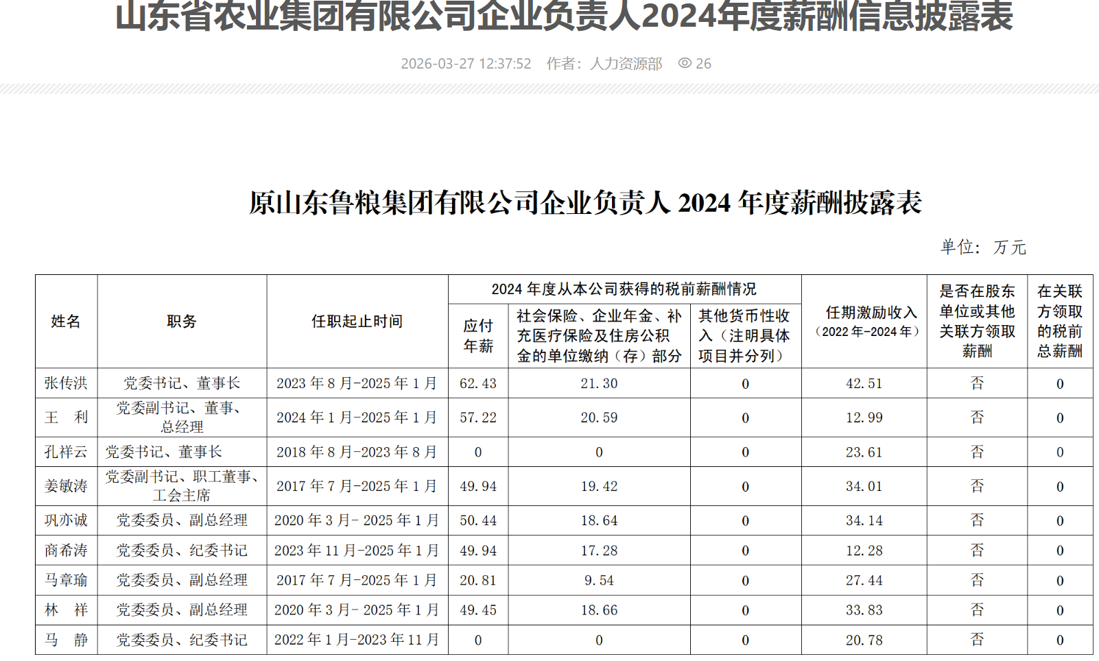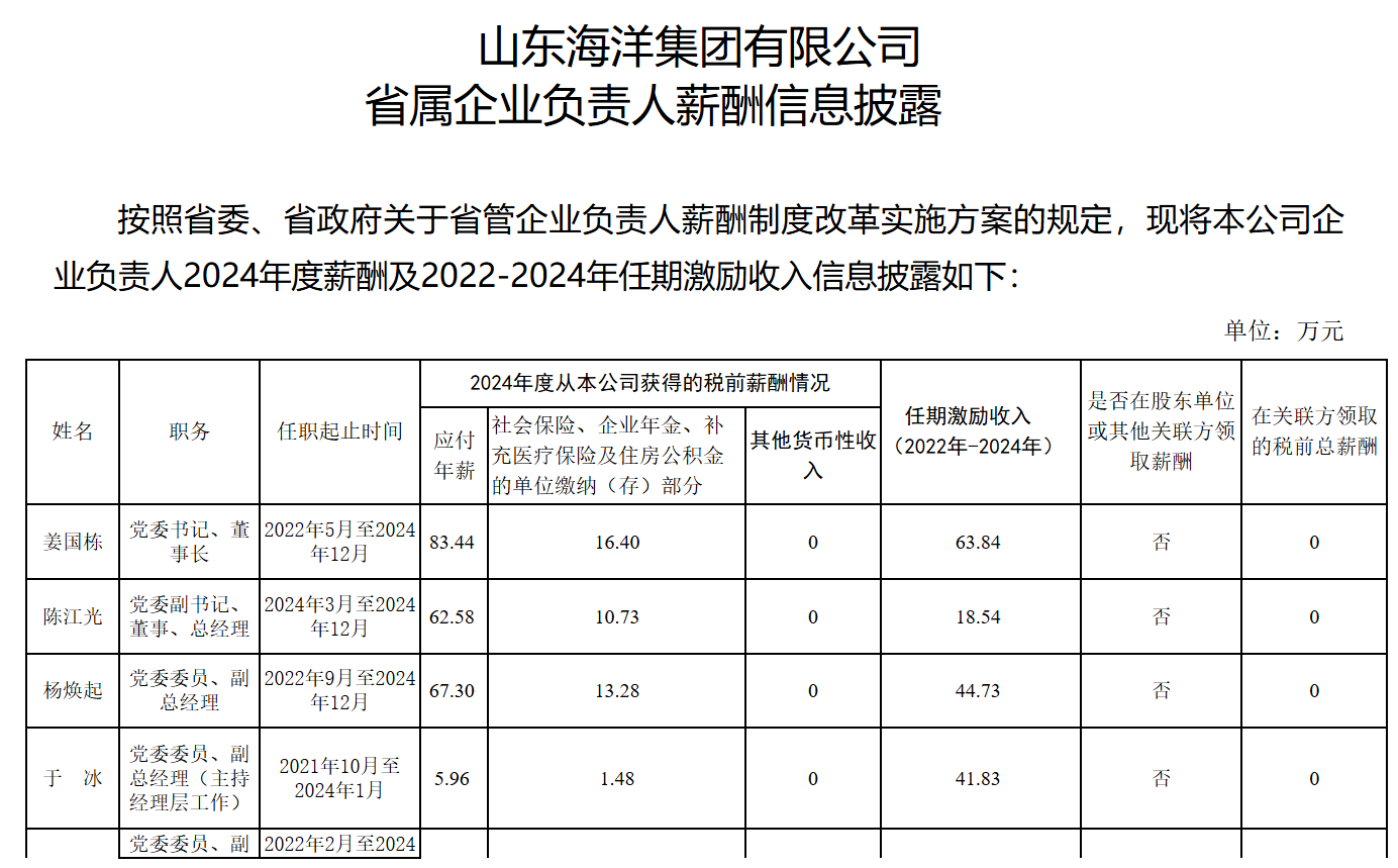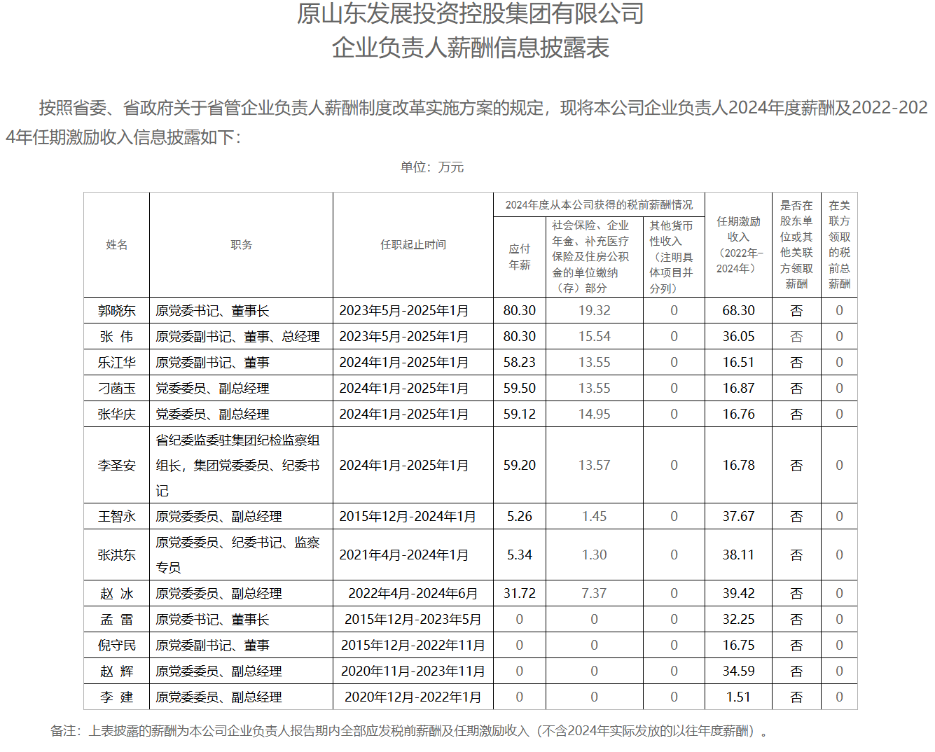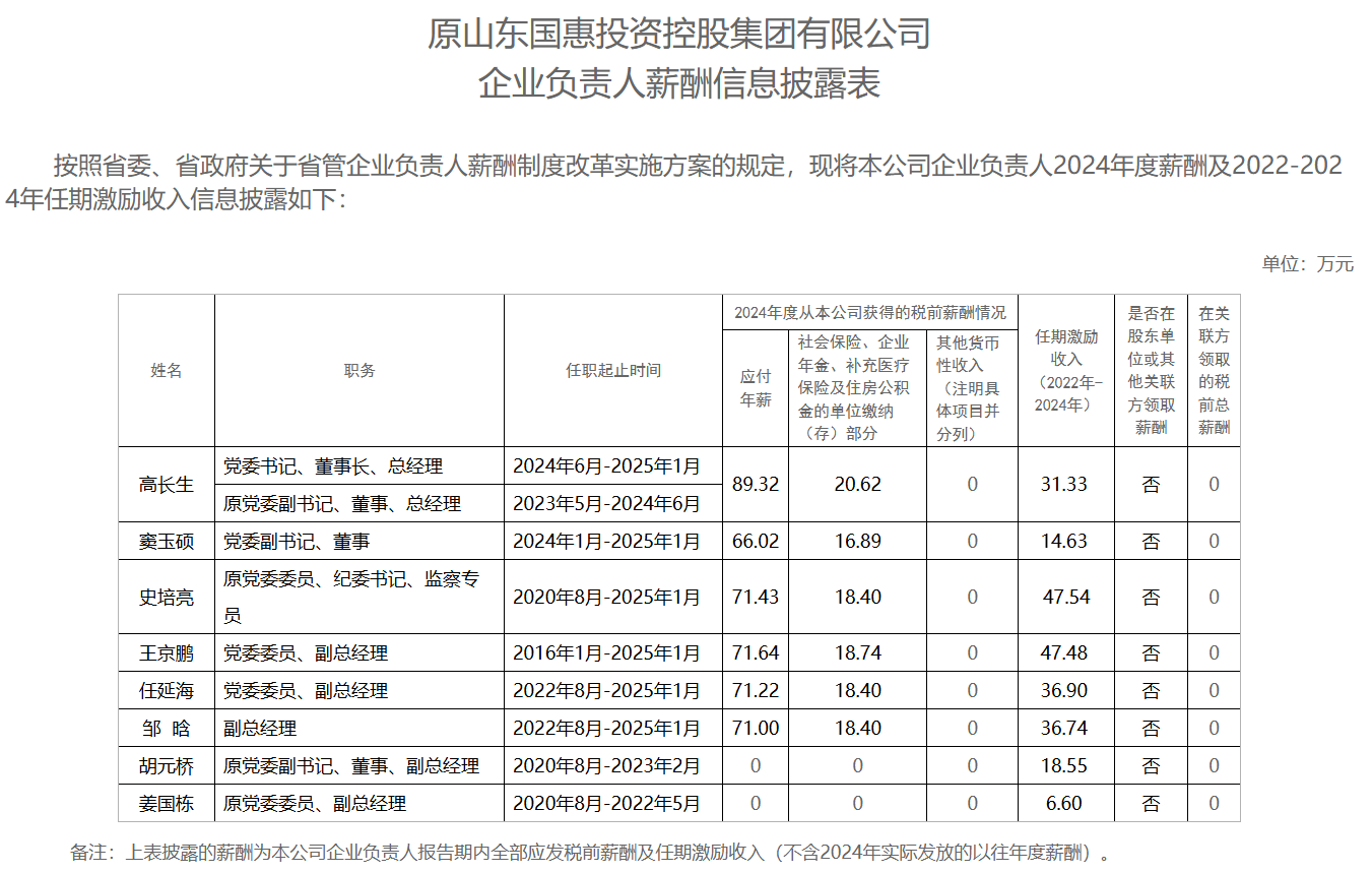 山东发展投资控股集团有限公司是2025年由原山东发展投资控股集团有限公司和原山东国惠投资控股集团有限公司两家企业战略重组后成立的,此次披露的“年薪”也为两家企业负责人的薪酬,担任重组后新集团董事长的高长生应付年薪89.32万元,2024年6月—2025年1月,其担任原山东国惠投资控股集团有限公司党委书记、董事长、总经理,2023年5月—2024年6月期间担任该公司党委副书记、董事、总经理。