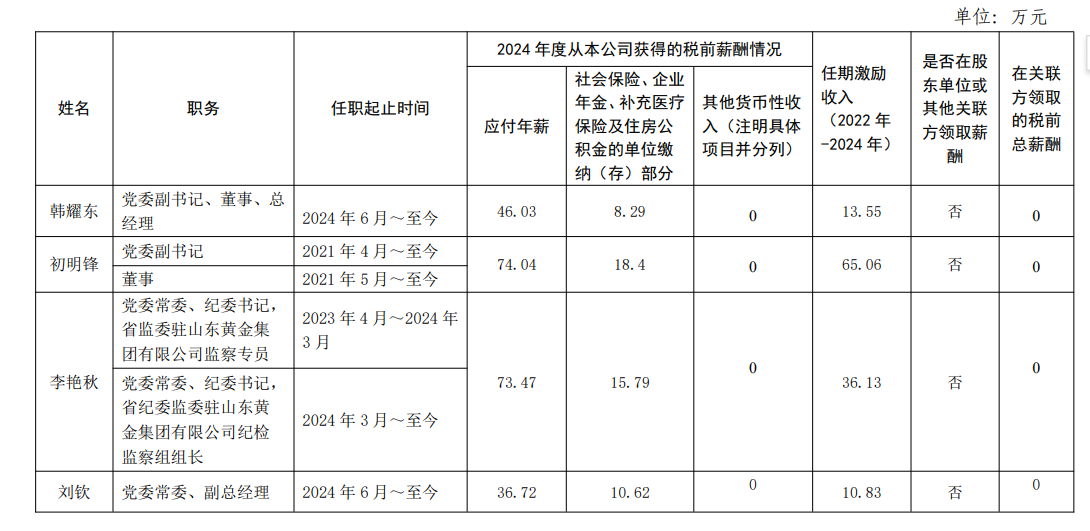 山东黄金集团有限公司企业负责人薪酬信息披露表