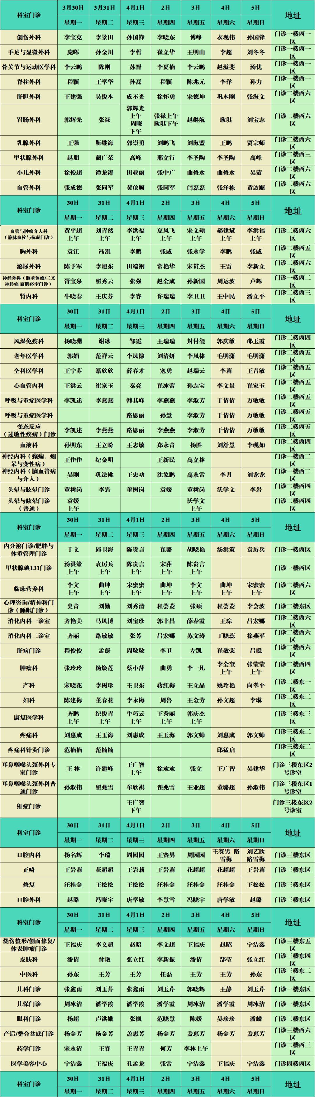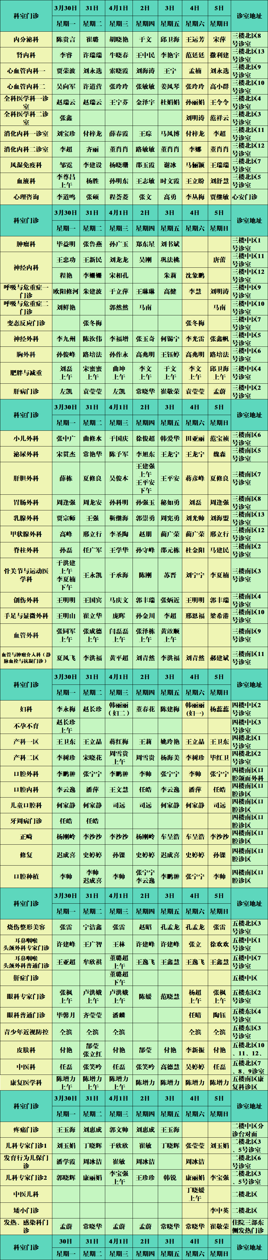 滨州市人民医院3月30日-4月5日门诊医生值班表