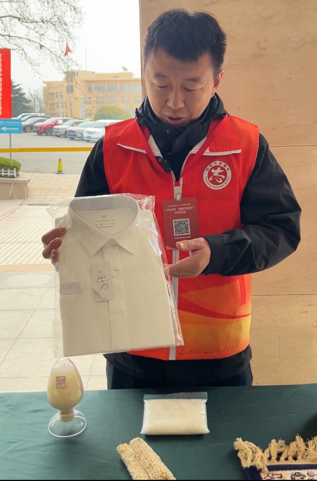 当有人好奇地询问制作过程时,张忠莲耐心解释道:“就是把塑料瓶的瓶盖和标签去掉,只留瓶身,切成切片后拉丝,拉丝之后就和正常的纺织品一样了,最后织成布料,做成产品。这两件衬衣都是用同样的工艺做成的。”