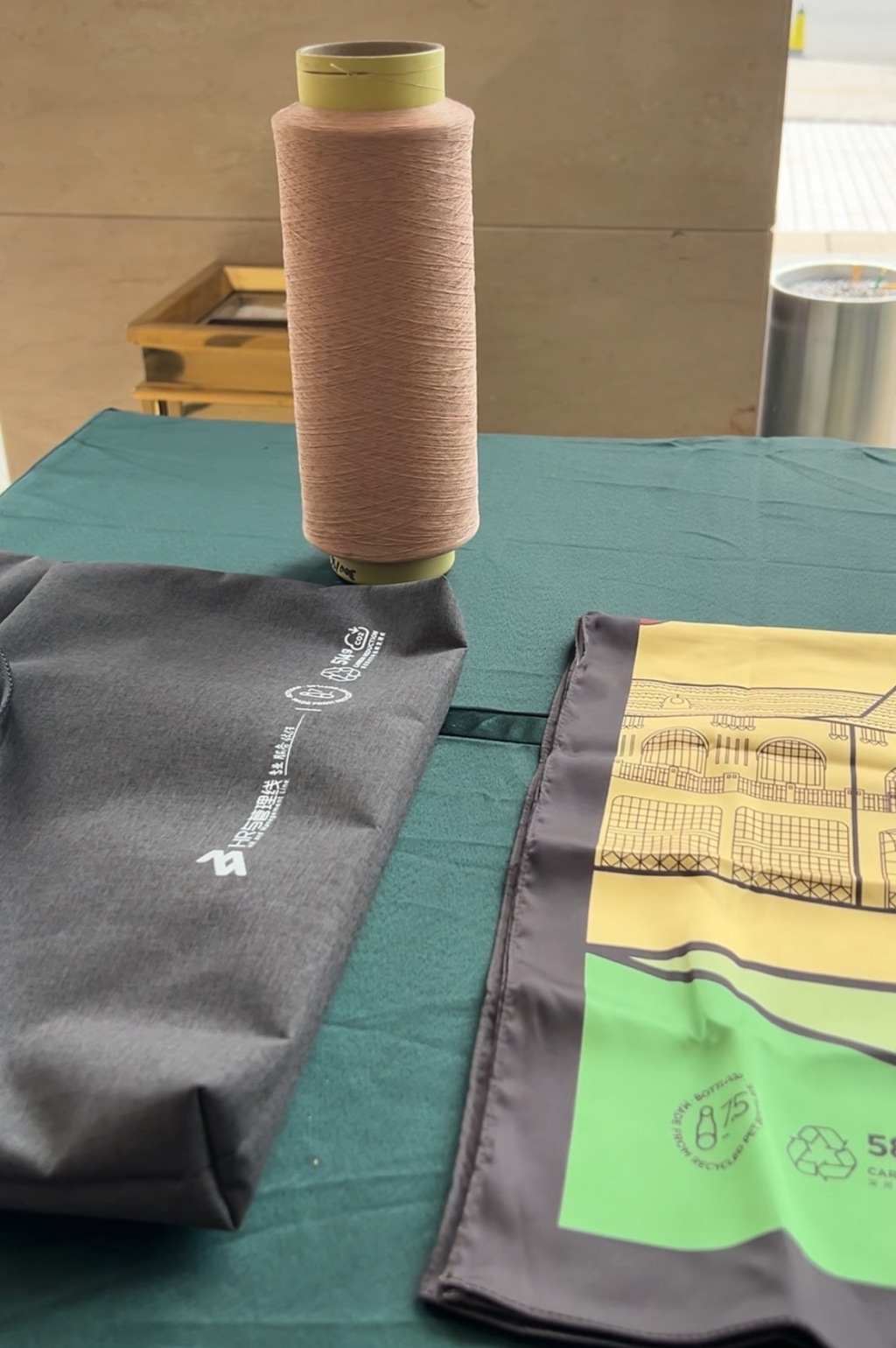 “两个塑料瓶,就可以减碳156克。” 山东省循环经济协会执行会长张忠莲指着旁边的一条丝巾和一款手提包继续说道,“这条丝巾是用7个半塑料瓶生产的,减碳585克;这个会议包用了7个塑料瓶,减碳514克。”观众纷纷凑近观察,难以想象这些精致的纺织品竟然来自废弃的塑料瓶。