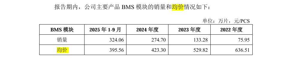 数据显示,力高新能BMS模块2022年的售卖均价为636.51元/PCS,到了2025年前三季度,均价降至395.56元/PCS。对此,公司称,受新能源汽车零售价格下调并向零部件企业传导、原材料采购价格波动等因素综合影响,BMS模块销售均价呈现逐年下降趋势。