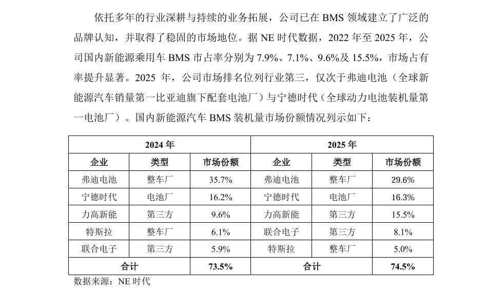 根据NE时代统计,力高新能在2024年及2025年中国新能源乘用车BMS市场中,装机量仅次于比亚迪及宁德时代位列第三,在第三方BMS厂商中排名第一。