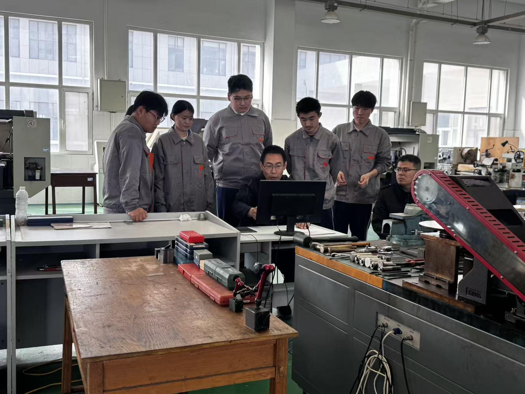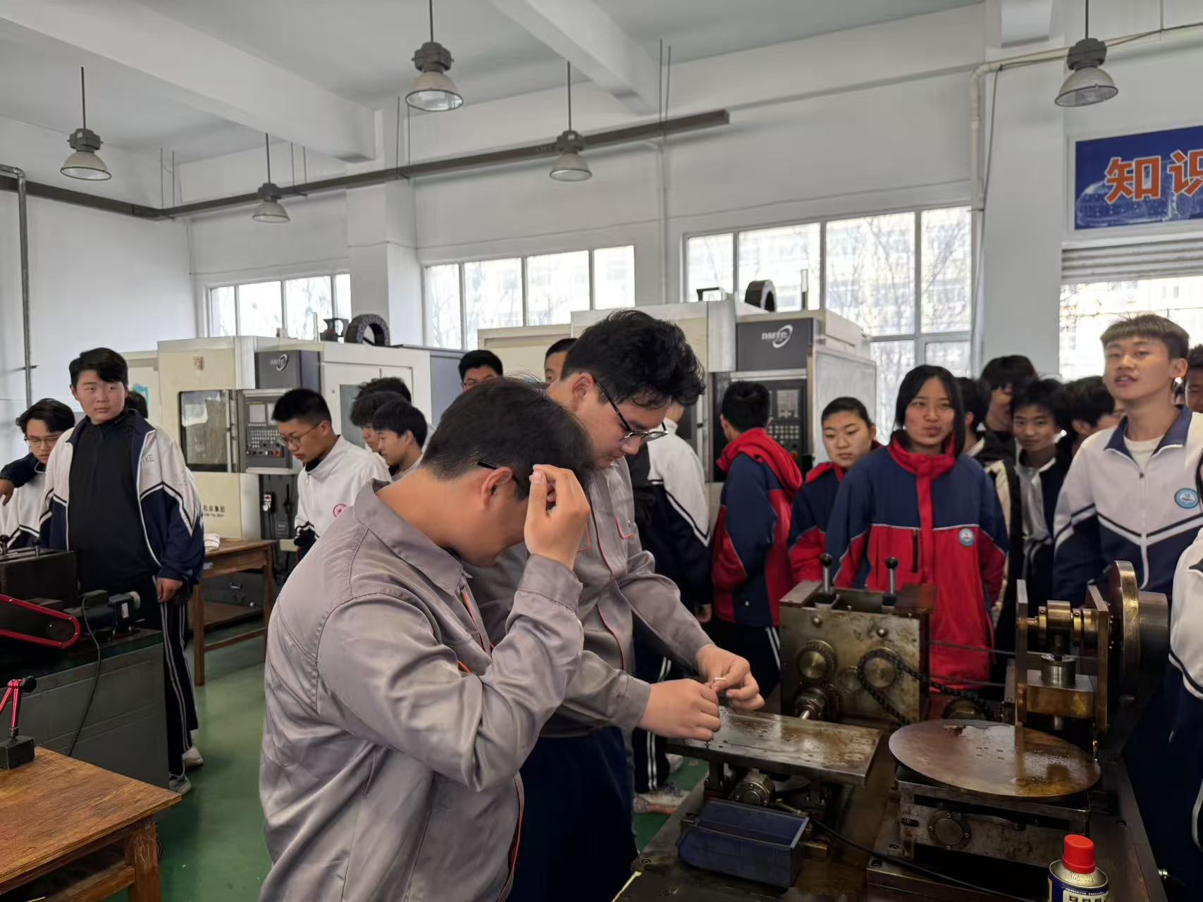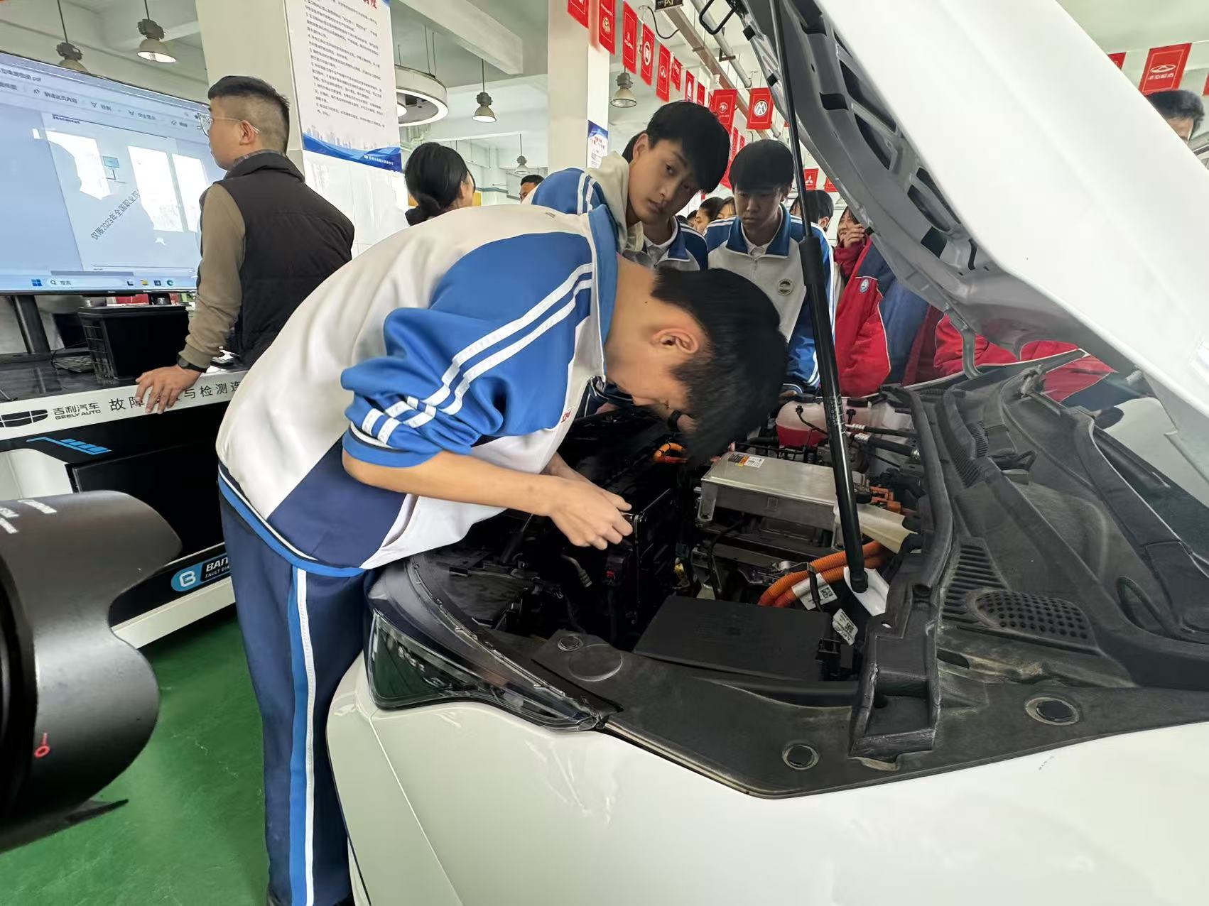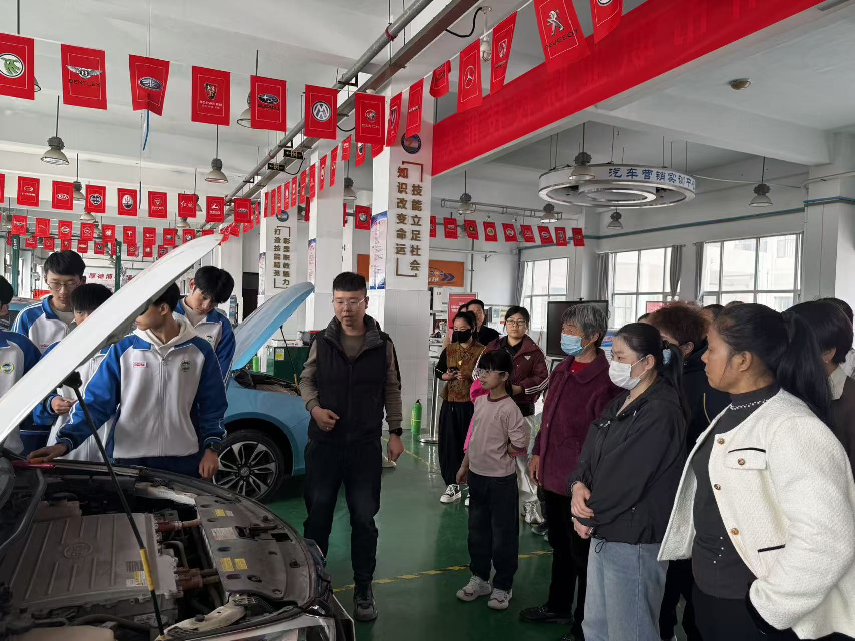 上午9时许,参观活动在实训场地正式拉开序幕。在无人机实训场地,同学们第一次近距离接触专业无人机设备,认真聆听讲解,表现出浓厚兴趣;机电专业实训车间内,设备排列整齐,操作台前学生熟练展示操作流程,吸引了众多家长驻足观看、频频点头;汽修实训基地更成为男生们流连忘返的“热门区域”,从发动机拆装到故障诊断,真实的生产环境让参观者直观感受到专业技能教学的扎实与规范。