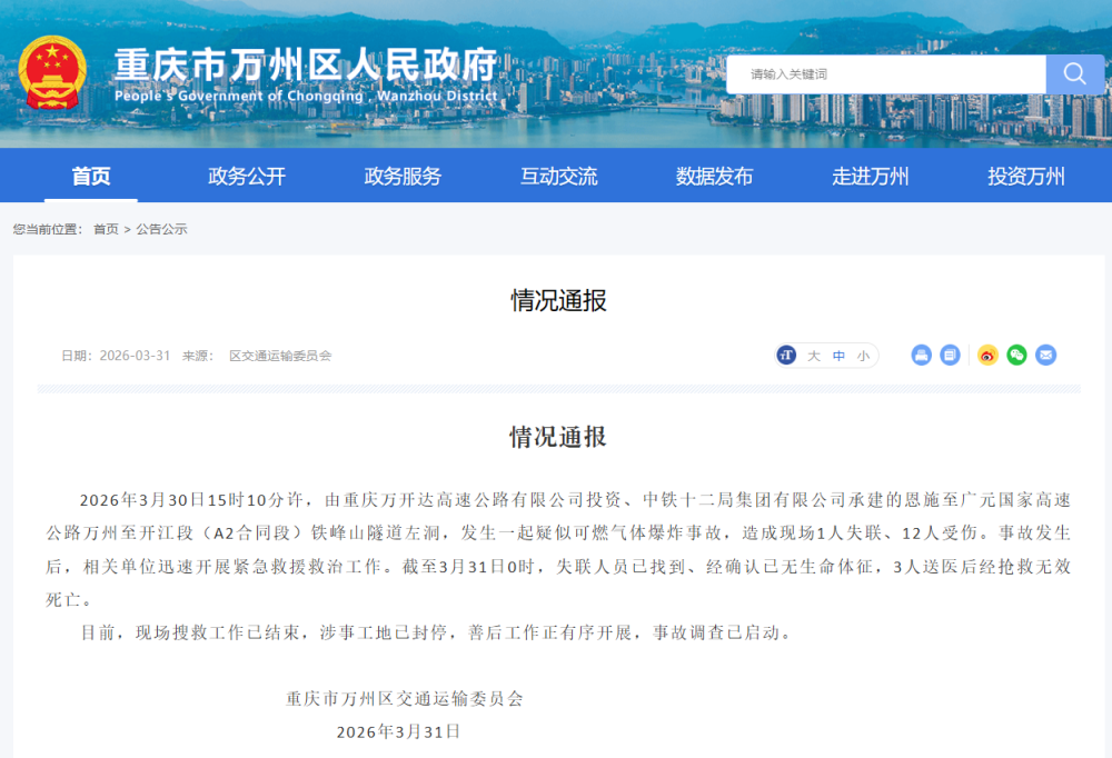 2026年3月30日15时10分许,由重庆万开达高速公路有限公司投资、中铁十二局集团有限公司承建的恩施至广元国家高速公路万州至开江段(A2合同段)铁峰山隧道左洞,发生一起疑似可燃气体爆炸事故,造成现场1人失联、12人受伤。事故发生后,相关单位迅速开展紧急救援救治工作。截至3月31日0时,失联人员已找到、经确认已无生命体征,3人送医后经抢救无效死亡。