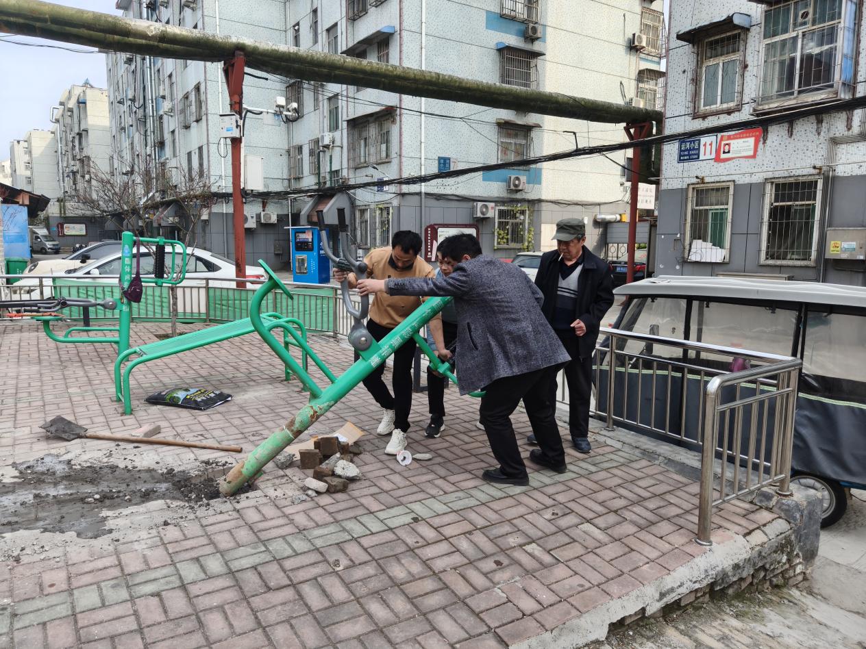 得知这一情况后,运河东区党支部高度重视,立即组织人员现场查看,并与小区志愿者代表共同商讨解决方案。经充分沟通协调,决定由物业出资采购水泥、砂石、紧固件等维修物资,同时发动小区志愿者力量,共同对故障器材进行加固修复。