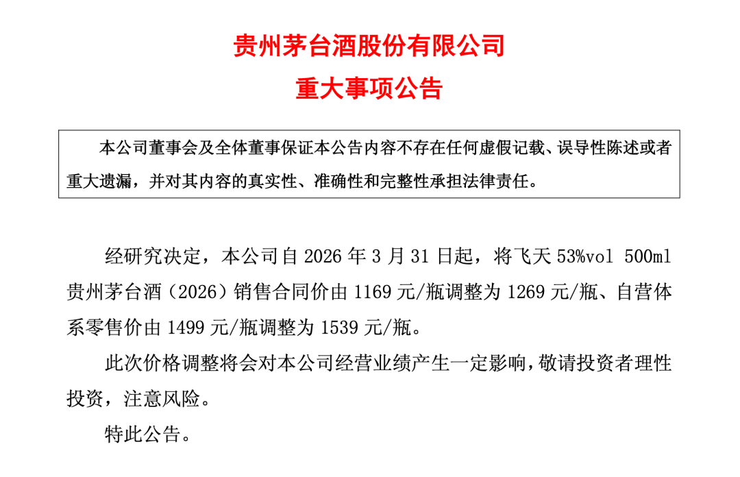 3月30日晚间,贵州茅台发布公告,内容显示,经研究决定,贵州茅台自2026年3月31日起,将飞天53%vol500ml贵州茅台酒(2026)销售合同价(出厂价)由1169元/瓶调整为1269元/瓶、自营体系零售价由1499元/瓶调整为1539元/瓶。