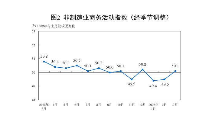 3月份,非制造业商务活动指数为50.1%,比上月上升0.6个百分点,高于临界点,非制造业景气水平有所改善。