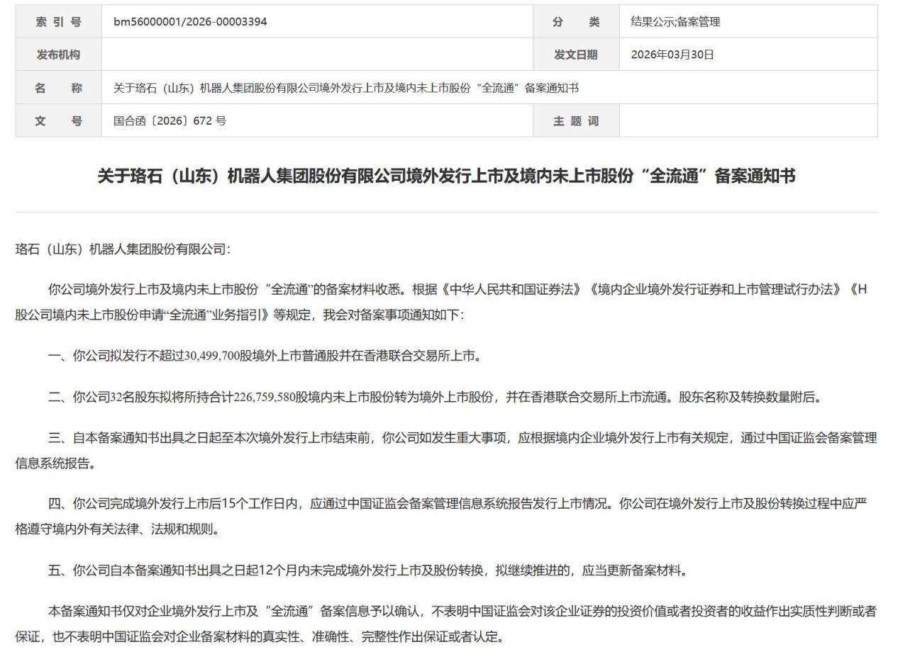 根据证监会3月26日出具的备案通知书内容,珞石机器人拟发行不超过3049.97万股境外上市普通股并在港交所上市,同时公司32名股东拟将合计持有的2.27亿股境内未上市股份转为境外上市股份,在港交所上市流通。备案通知书有效期为出具之日起12个月,若在此期限内未完成发行上市及股份转换,公司拟继续推进的需更新备案材料。