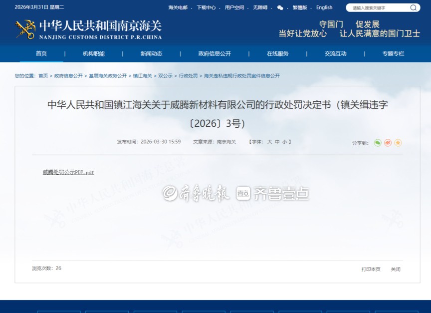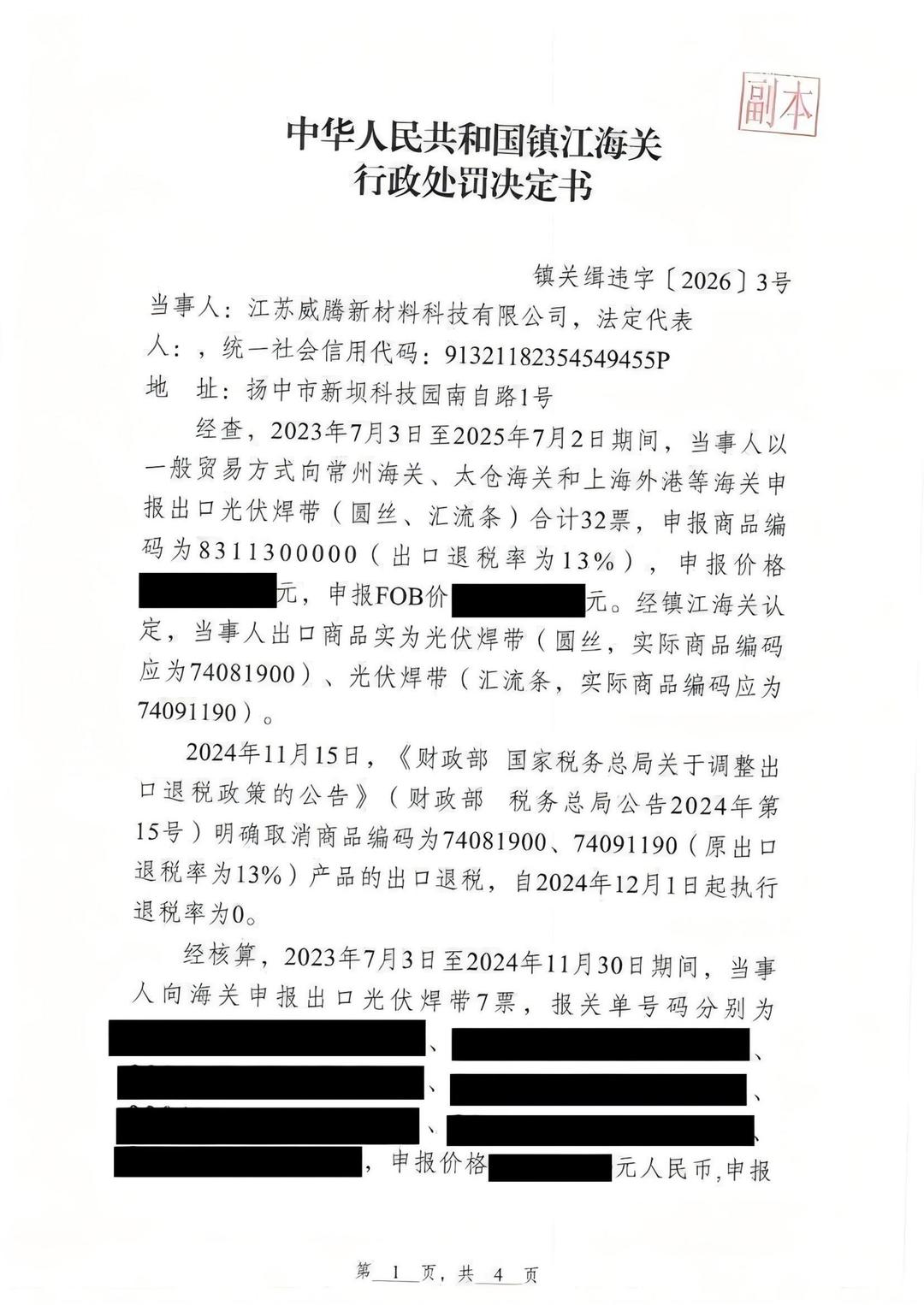 近日,中华人民共和国镇江海关发布行政处罚决定书(镇关缉违字〔2026〕3号),对江苏威腾新材料科技有限公司涉嫌商品编码申报不实的违规行为作出罚款145.2万元人民币的处罚决定。