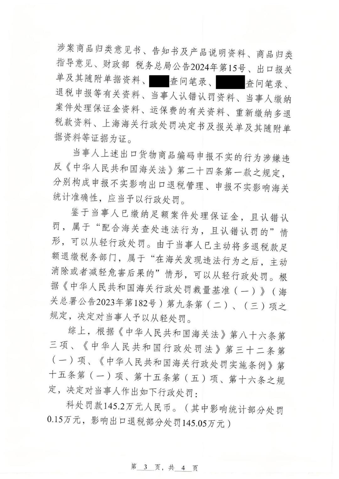 鉴于当事人在案件调查过程中积极配合,已缴纳足额案件处理保证金420万元人民币,并出具认错认罚承诺,同时主动将多退税款1885317.62元人民币退回税务部门国库,符合从轻处罚情形,镇江海关依据相关法律法规,决定对当事人予以从轻处罚,最终科处罚款145.2万元人民币(其中影响统计部分处罚0.15万元,影响出口退税部分处罚145.05万元),处罚时间为2026年3月25日。