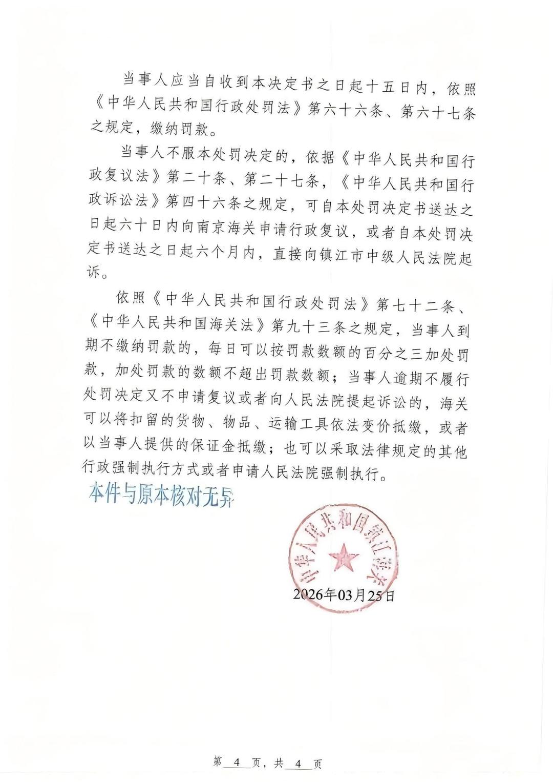 根据处罚决定书,当事人如不服处罚决定,可在收到决定书之日起六十日内向南京海关申请行政复议,或六个月内直接向镇江市中级人民法院提起诉讼。逾期不履行处罚决定,海关将依法采取加处罚款、保证金抵缴或申请人民法院强制执行等措施。