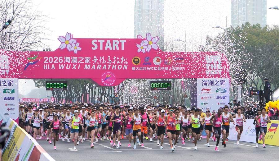 Participants start during the 2026 Wuxi Marathon on March 22, 2026. (Photo by Liu Zhenrui/Xinhua)