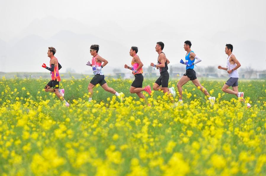 Runners in action during the 2026 Qujing Luoping Grand Blossom Marathon in southwest China's Yunnan Province, March 15, 2026. (Xinhua)