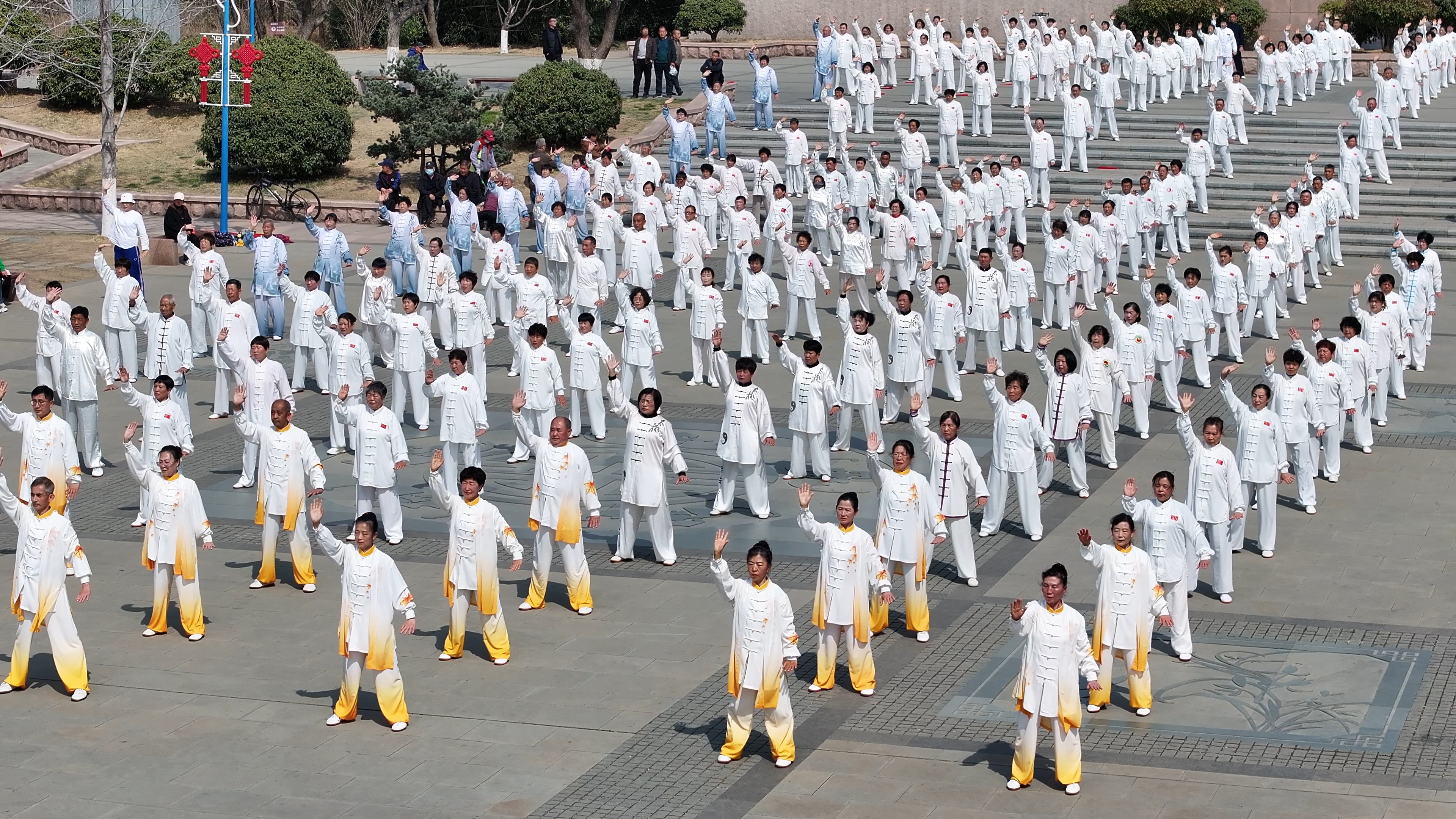 即墨大夫广场上,百余名群众身着统一服饰,在悠扬古乐声中展演八段锦。队伍动作整齐划一,行云流水,展现出市民群众健康向上、充满活力的精神风貌,以实际行动倡树健康生活方式。