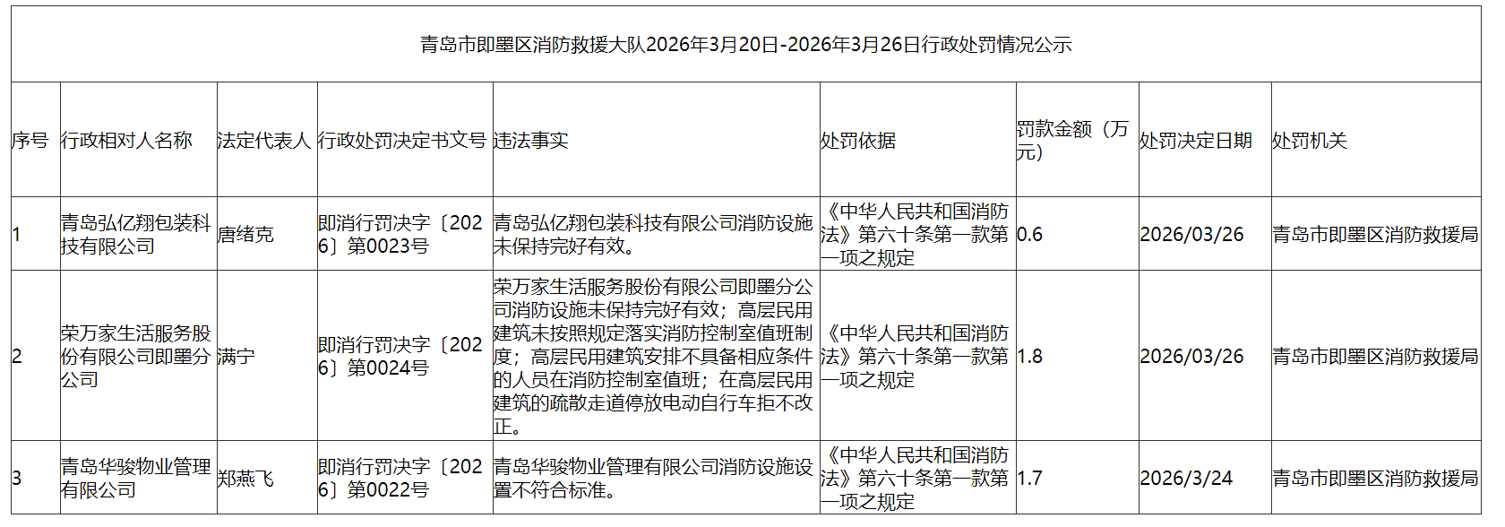 3月31日,即墨区应急管理发布行政处罚情况公示,因消防设施未保持完好有效、消防设施设置不符合标准等原因,青岛弘亿翔包装科技有限公司、荣万家生活服务股份有限公司即墨分公司、青岛华骏物业管理有限公司等3家企业被行政处罚。(半岛全媒体记者华敬方)
