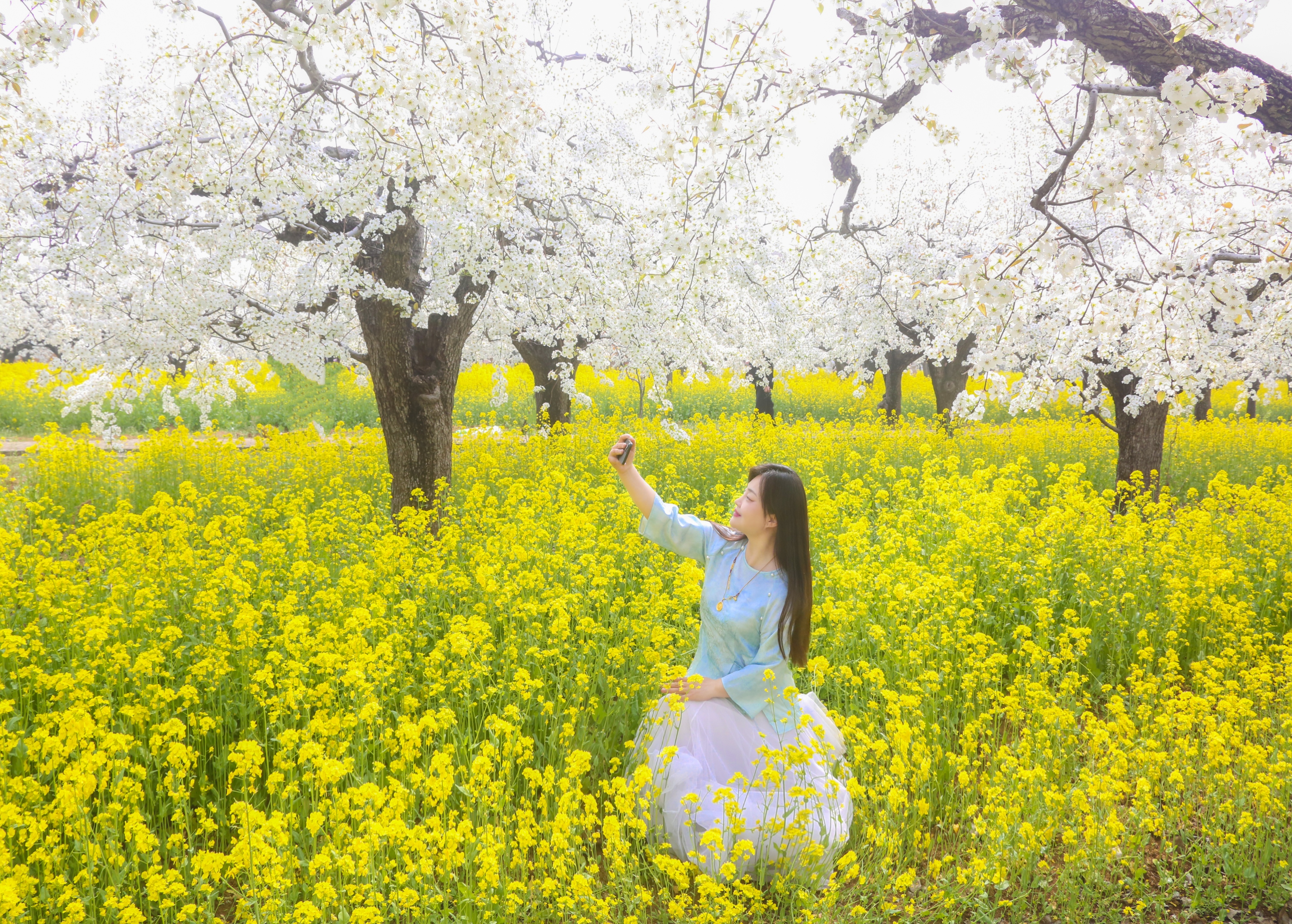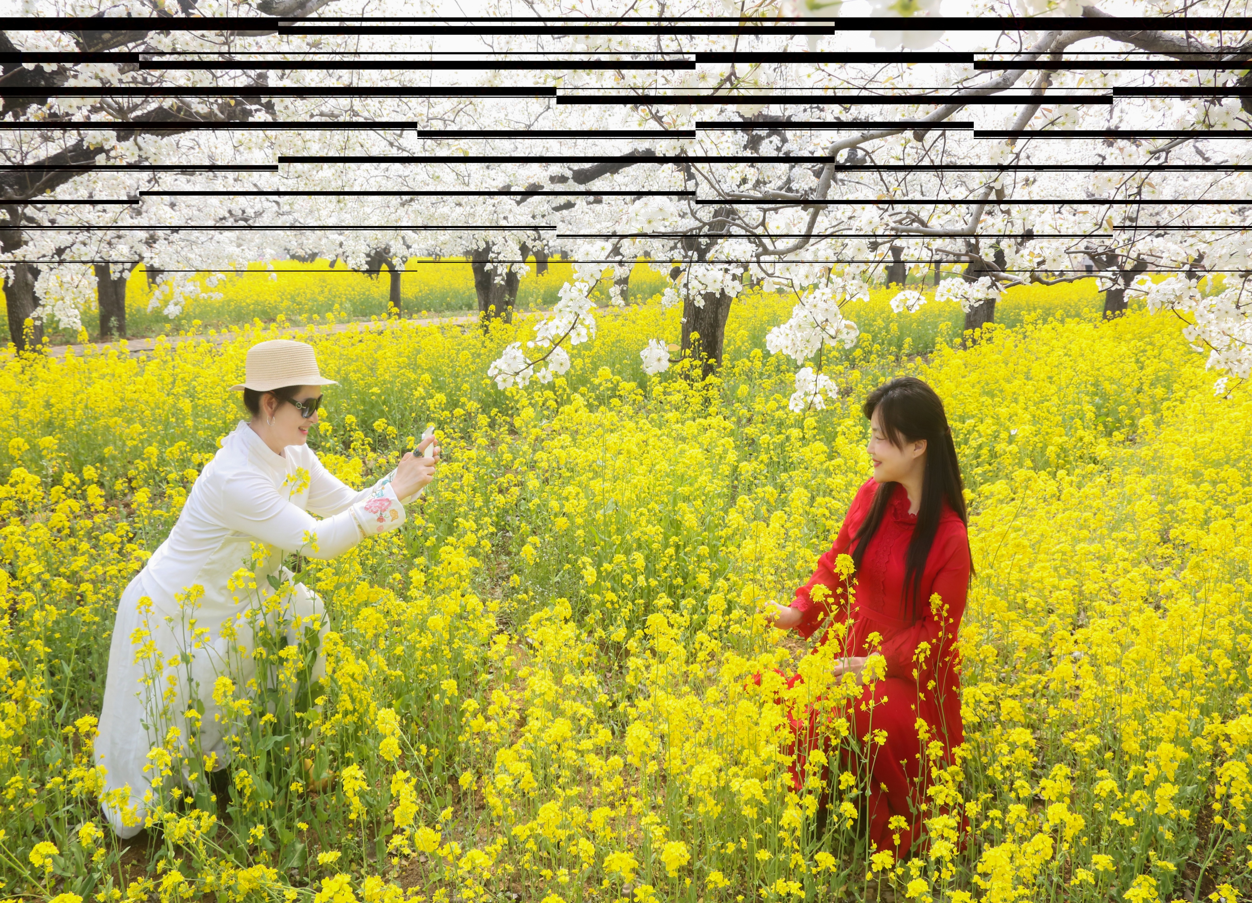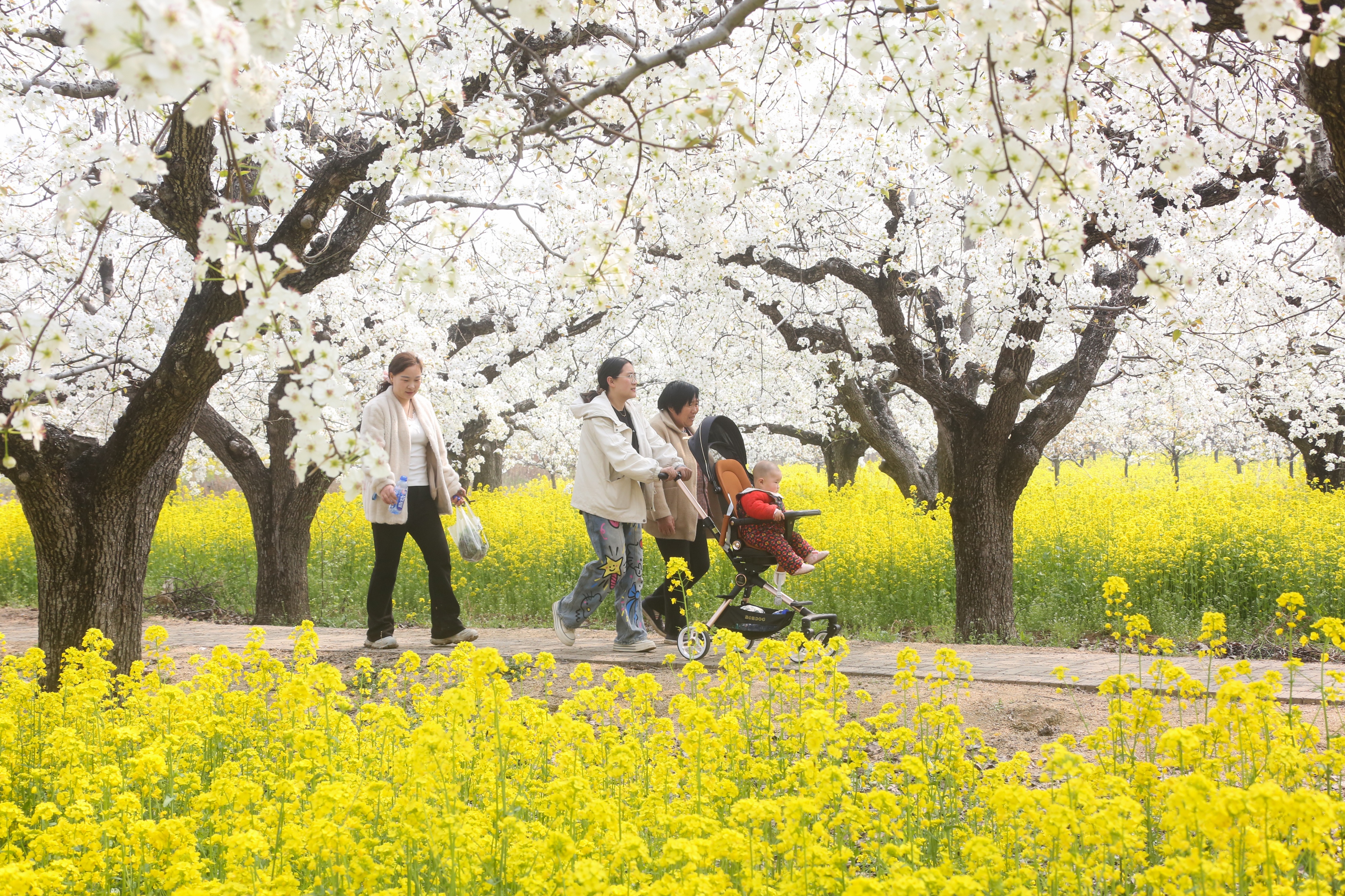 3月31日,游客在济宁邹城市香城镇老龙湾梨花园赏花拍照。近日,邹城市老龙湾数百棵60年以上树龄的老梨树竞相开花,与梨树下盛开的油菜花相映成辉,勾勒出一幅美丽图景,吸引众多市民、游客前来休闲赏花。(大众新闻记者吕光社通讯员吕卫锋)