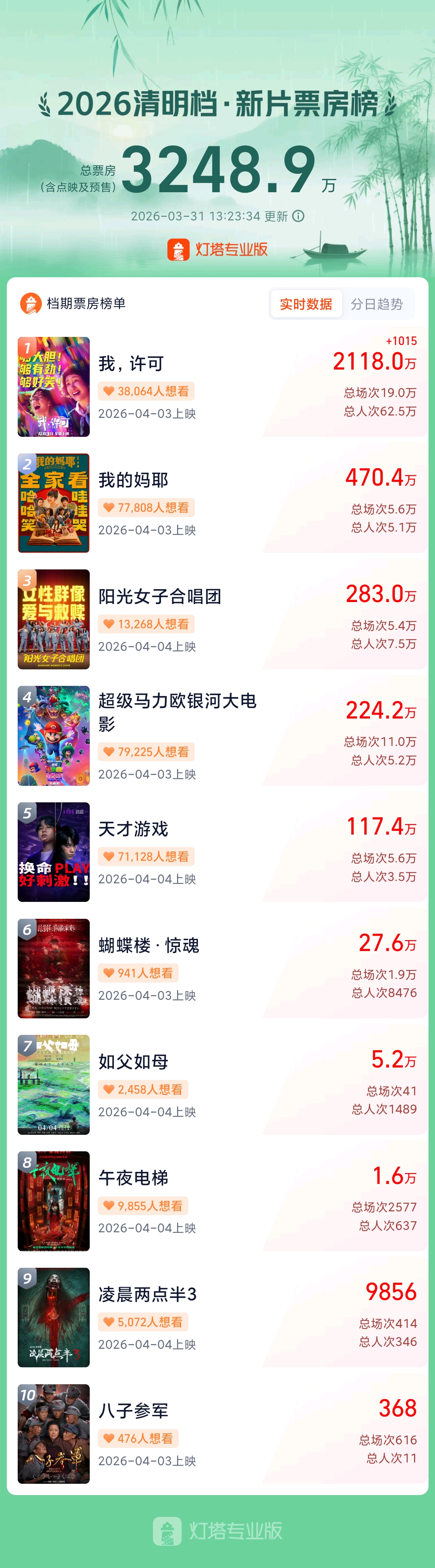 据网络平台数据,截至3月31日13时23分,2026年清明档新片点映及预售总票房突破3200万,影片《我,许可》《我的妈耶》《阳光女子合唱团》《超级马力欧银河大电影》《天才游戏》暂列前五。大众新闻·齐鲁壹点记者刘宗智