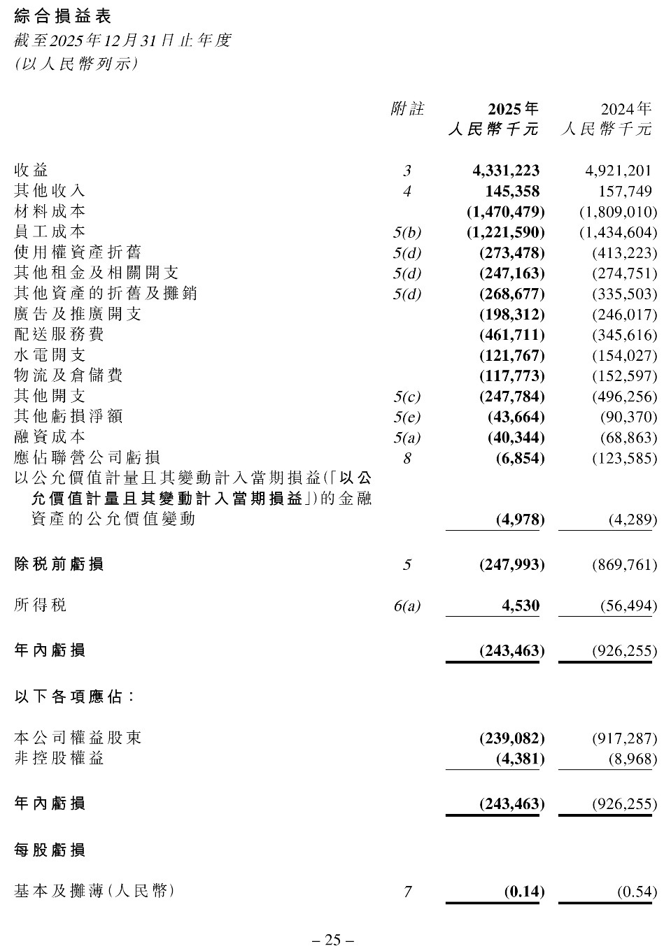3月26日晚间,“新茶饮第一股”奈雪的茶发布2025年度业绩公告。报告显示,公司实现收益43.3亿元,同比减少12%,年内净亏损2.43亿元,已连续两年出现亏损。此前,公司于2023年实现扭亏为盈,当年经调整净利润0.21亿元,2024年内亏损扩大至9.26亿元,但2025年亏损有所收窄。