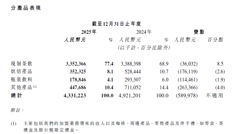 虽然奈雪的茶在产品线方面做出了改良,积极推出“每日蔬果瓶”“蔬果酸奶昔”等一系列现制饮品及烘焙产品,覆盖了从早餐、午餐、下午茶到晚餐的全时段消费需求,还是阻止不了整体营收下滑。新开辟的瓶装饮料与烘焙产品的贡献有限,相比2024年还略有下滑。