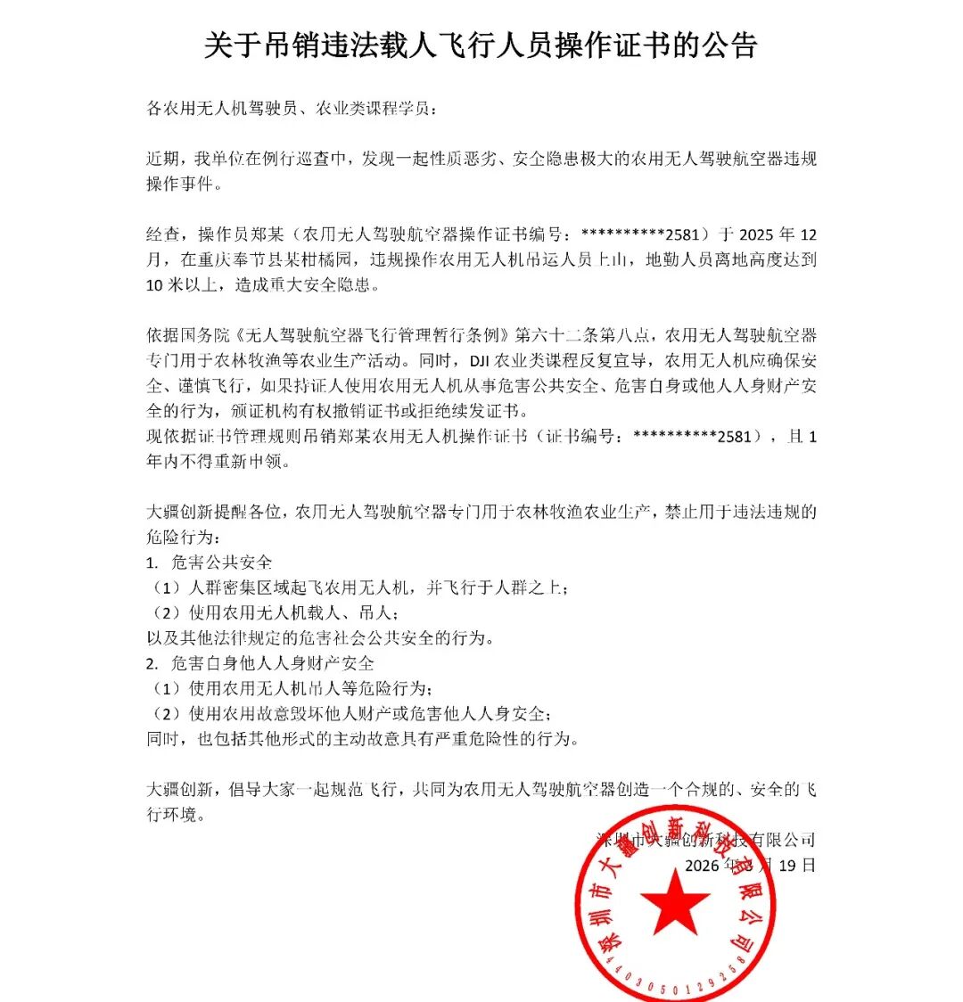近日,深圳市大疆创新科技有限公司发布关于吊销违法载人飞行人员操作证书的公告。