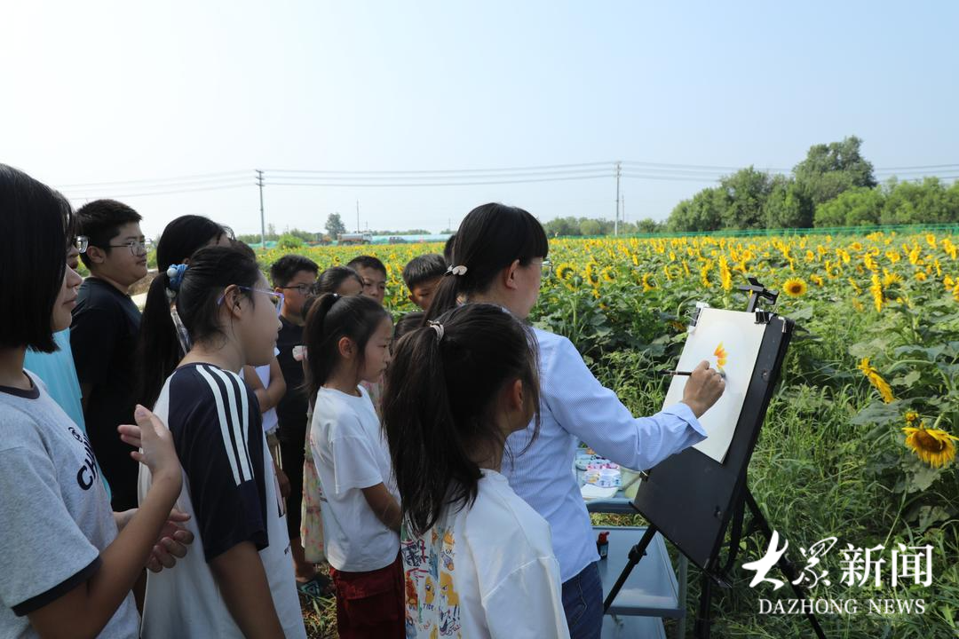 2025年8月12日,田家村文艺村长田敏带领孩子们在油葵花田里写生。