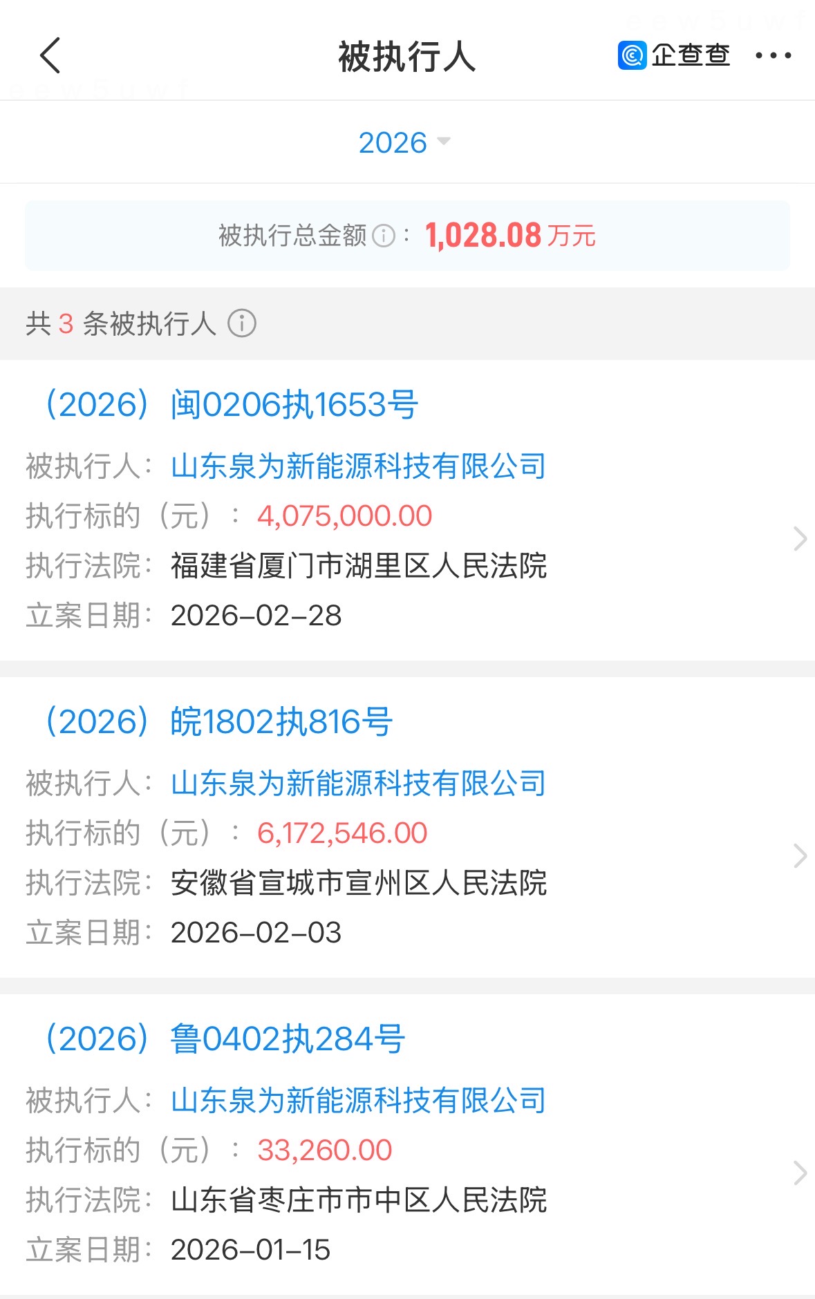 企查查App显示,山东泉为今年有3条“被执行人”信息,被执行总金额达1028.08万元。