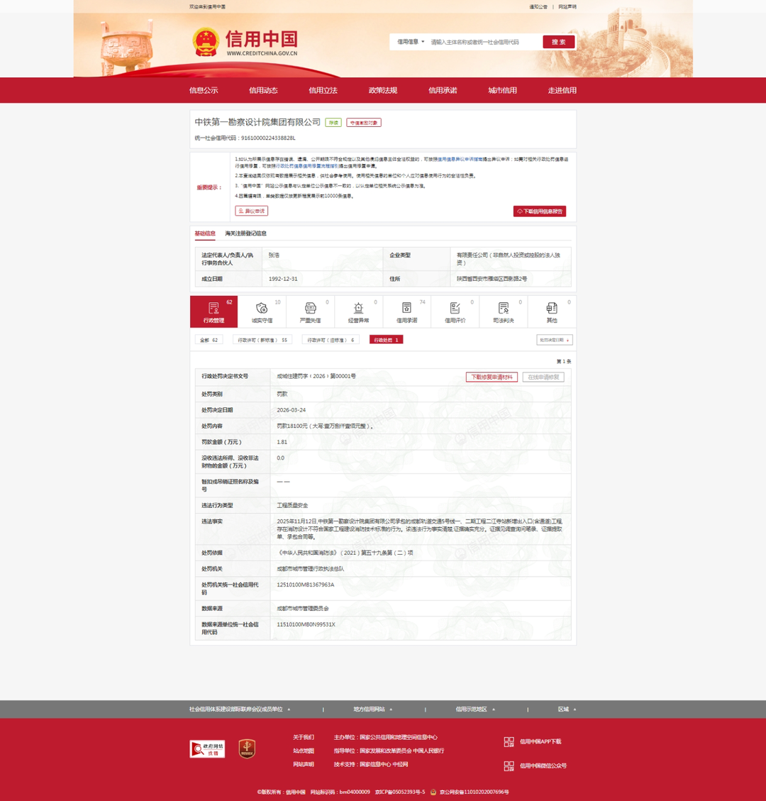 齐鲁晚报·齐鲁壹点记者于信用中国行政处罚栏获悉,3月24日,中国铁建(601186.SH/01186.HK)旗下的中铁第一勘察设计院集团有限公司(下称“铁一院”)因涉工程质量安全问题被行政处罚,处罚机关为成都市城市管理行政执法总队。