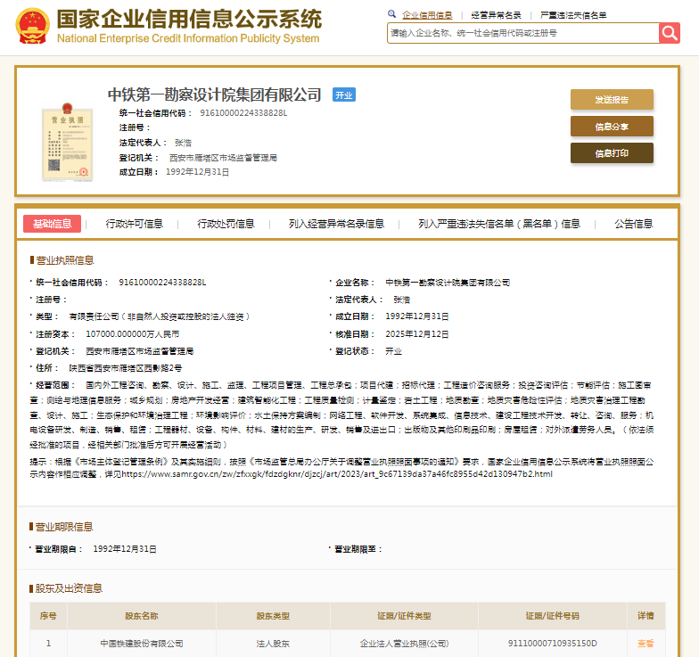 国家企业信用信息公示系统显示,中铁第一勘察设计院集团有限公司成立于1992年,注册资本107000万元人民币,法定代表人张浩,由中国铁建(601186.SH/01186.HK)全资持股。