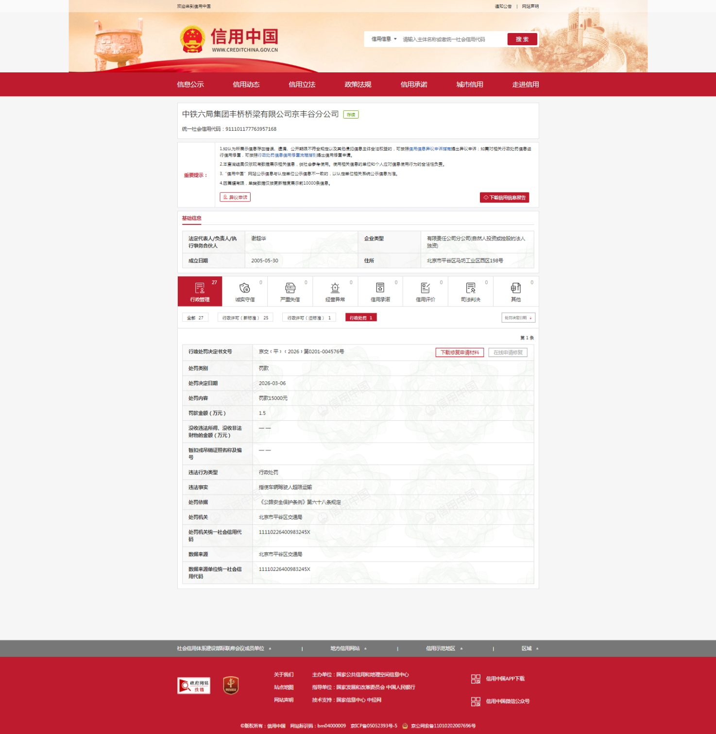 齐鲁晚报·齐鲁壹点记者于信用中国行政处罚栏获悉,3月6日,中铁六局集团丰桥桥梁有限公司京丰谷分公司(下称“中铁六局丰桥桥梁公司”)被行政处罚,处罚机关为北京市平谷区交通局。