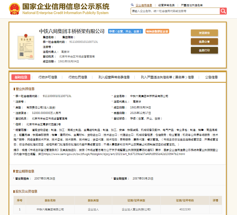 国家企业信用信息公示系统显示,中铁六局集团丰桥桥梁有限公司京丰谷分公司成立于2005年,负责人谢超华。其母公司中铁六局集团丰桥桥梁有限公司成立于1981年,注册资本32000万元人民币,法定代表人高振华,由中铁六局集团有限公司全资持股。