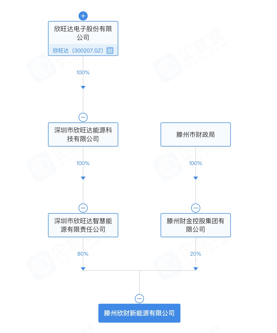 股权穿透显示,欣旺达智慧能源与滕州财金控股集团分别持有滕州欣财新能源有限公司80%、20%的股份。